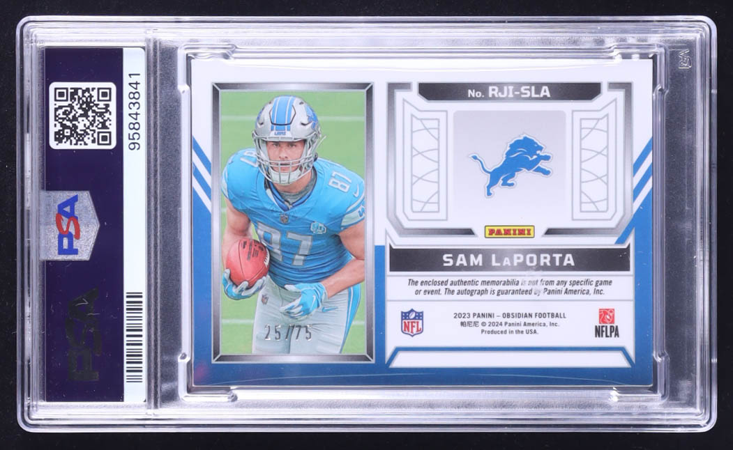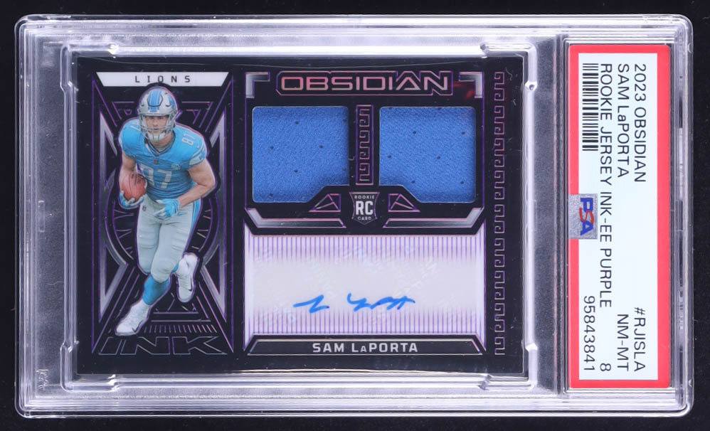 Sam LaPorta 2023 Panini Obsidian Rookie Jersey Ink Electric Etch Purple #27 #25/75 RC (PSA 8)