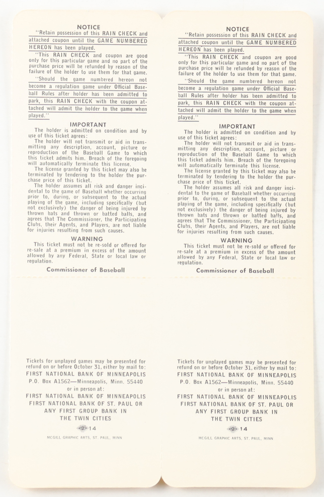 1970 Minnesota Twins World Series Uncut Game Three and Four uncut game tickets. Please note that the tickets are unsigned.