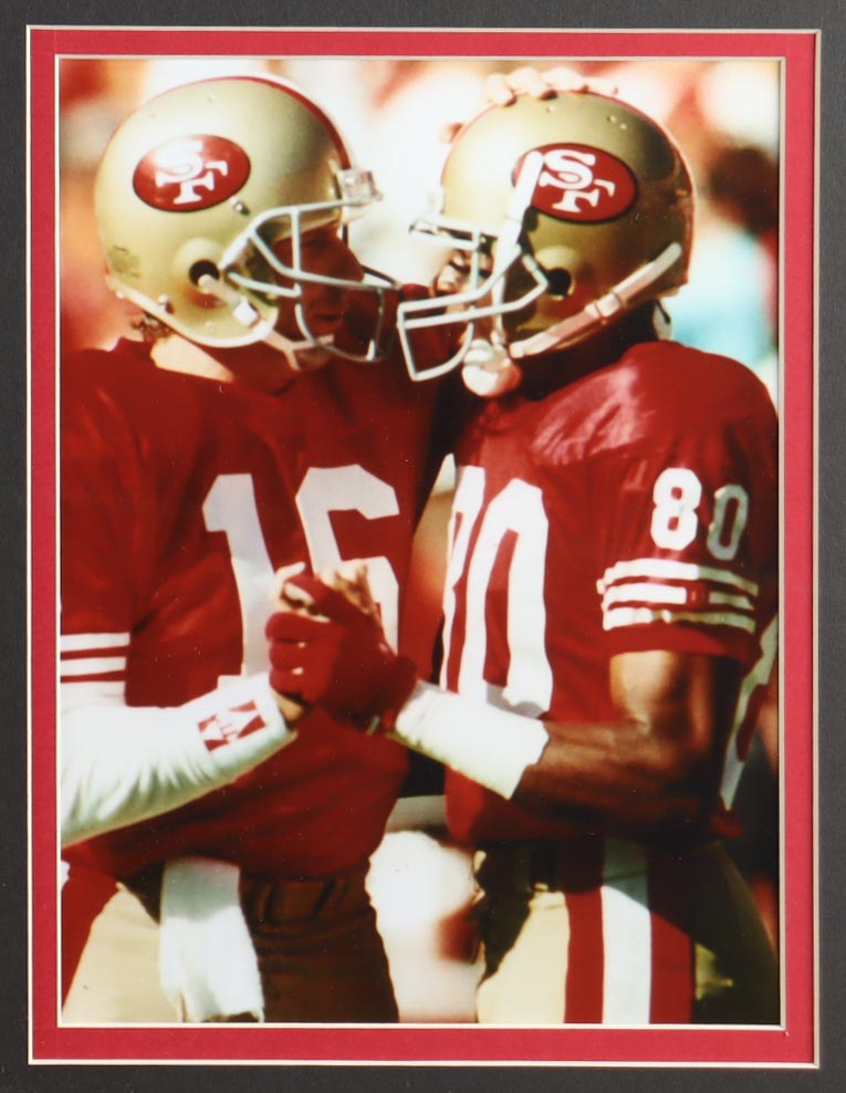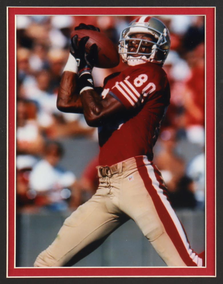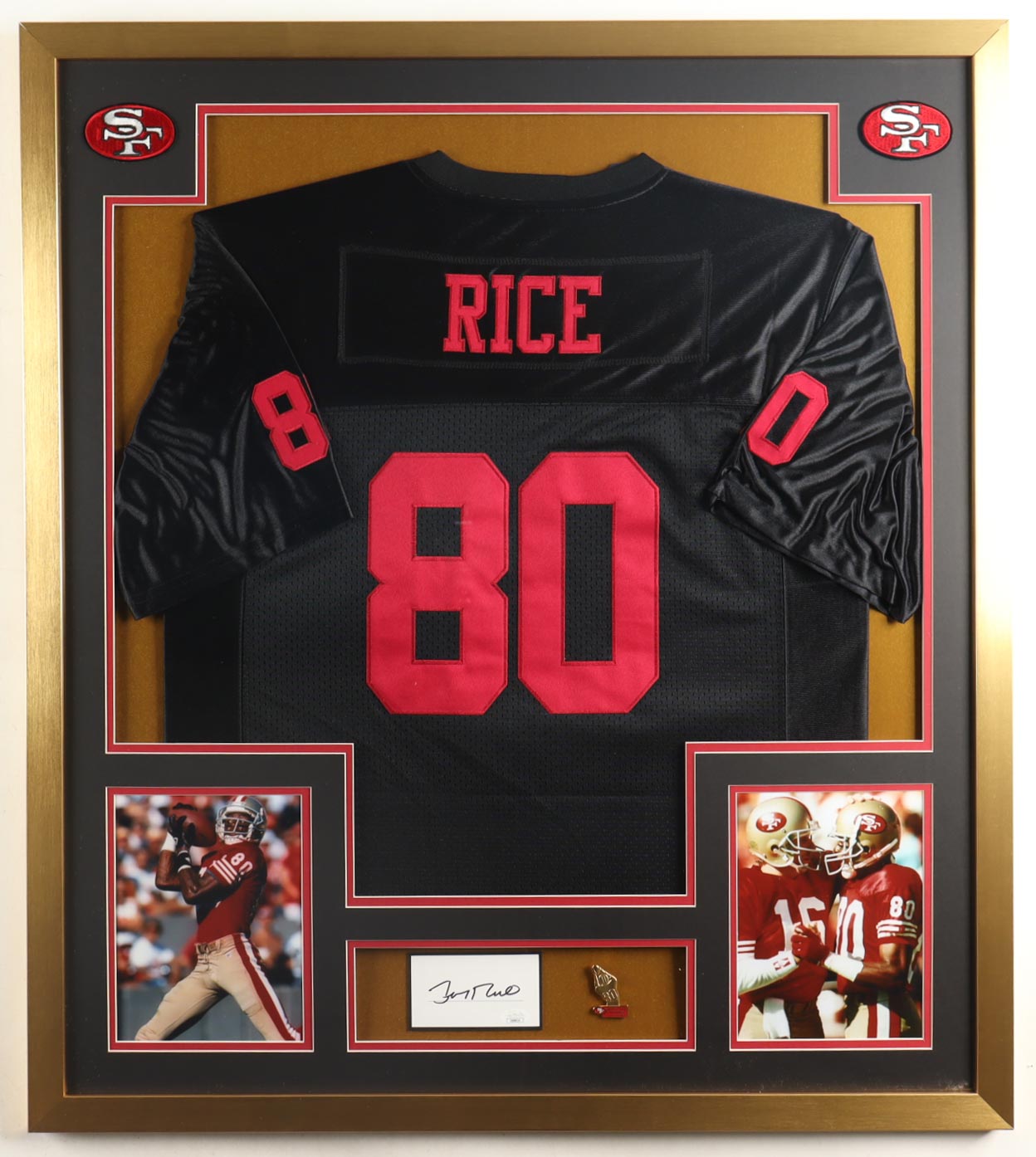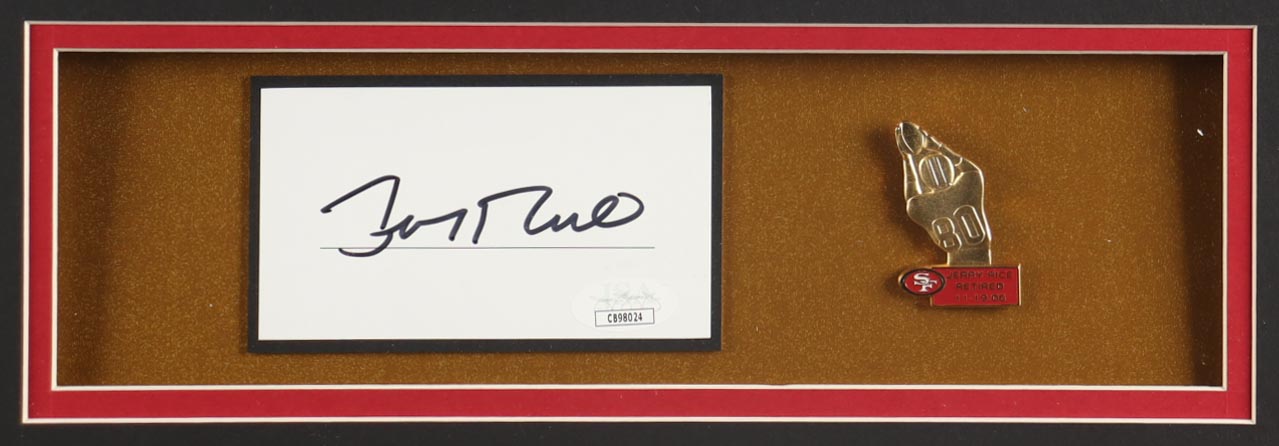 Custom frame measures approximately 32" x 36" in size and features a cut that has been hand-signed by Jerry Rice (HOF). The display also includes an unsigned jersey as well as a player retirement pin and (2) team logo cloth patches.