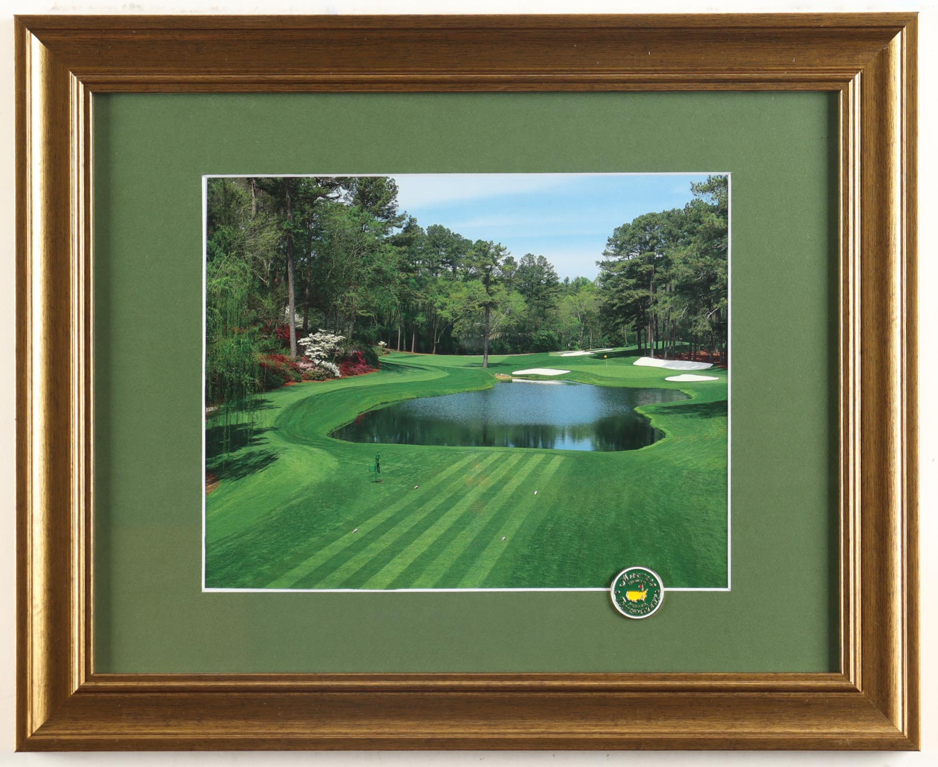 Custom frame measures approximately 13.25" x 16.25" in size. Features an unsigned photo of the Augusta National Golf Course and includes an official Masters pin. Please note, the display is unsigned.