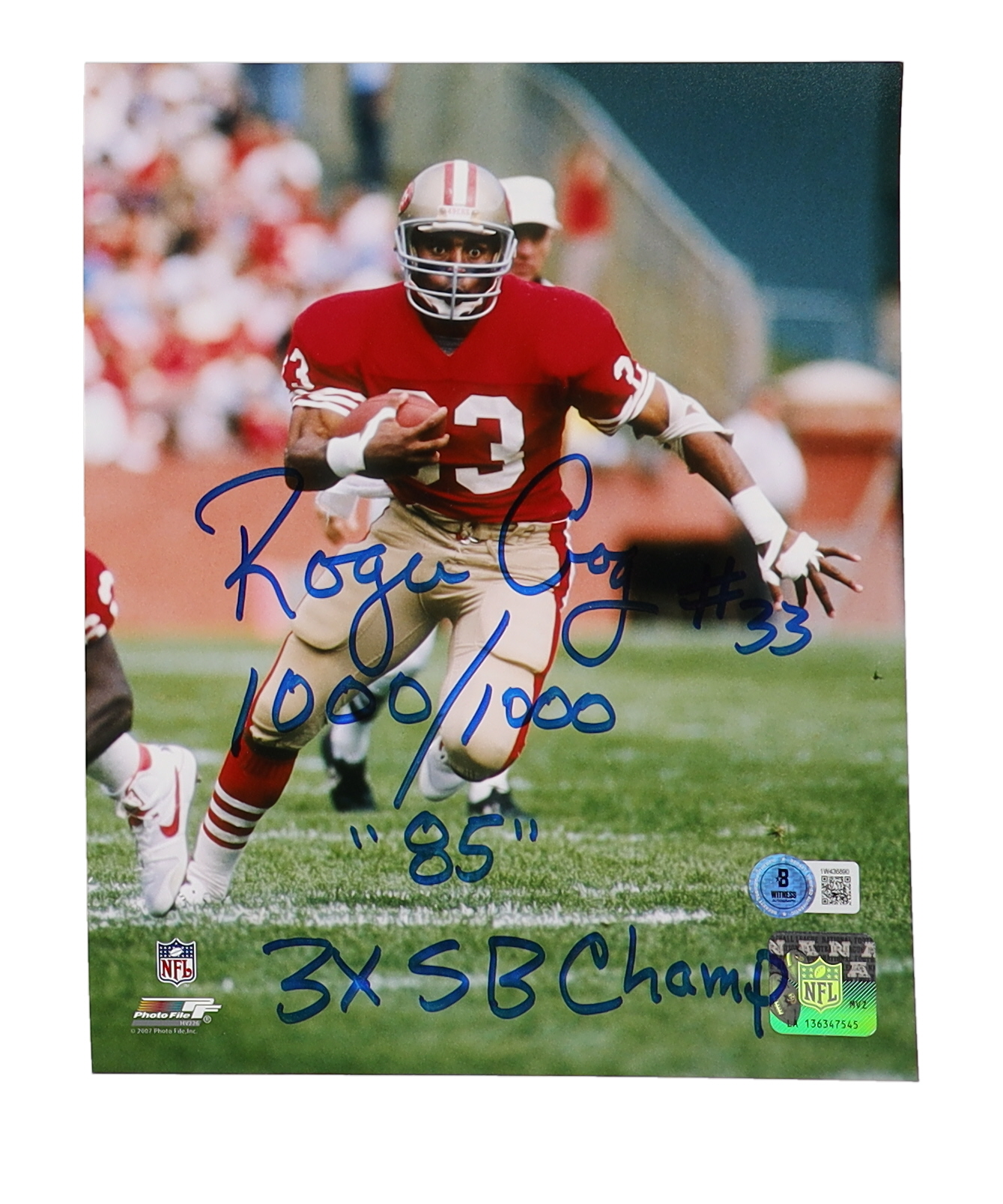 Photo measures approximately 8" x 10" in size. Hand-signed and inscribed by Roger Craig (San Fransisco 49ers).