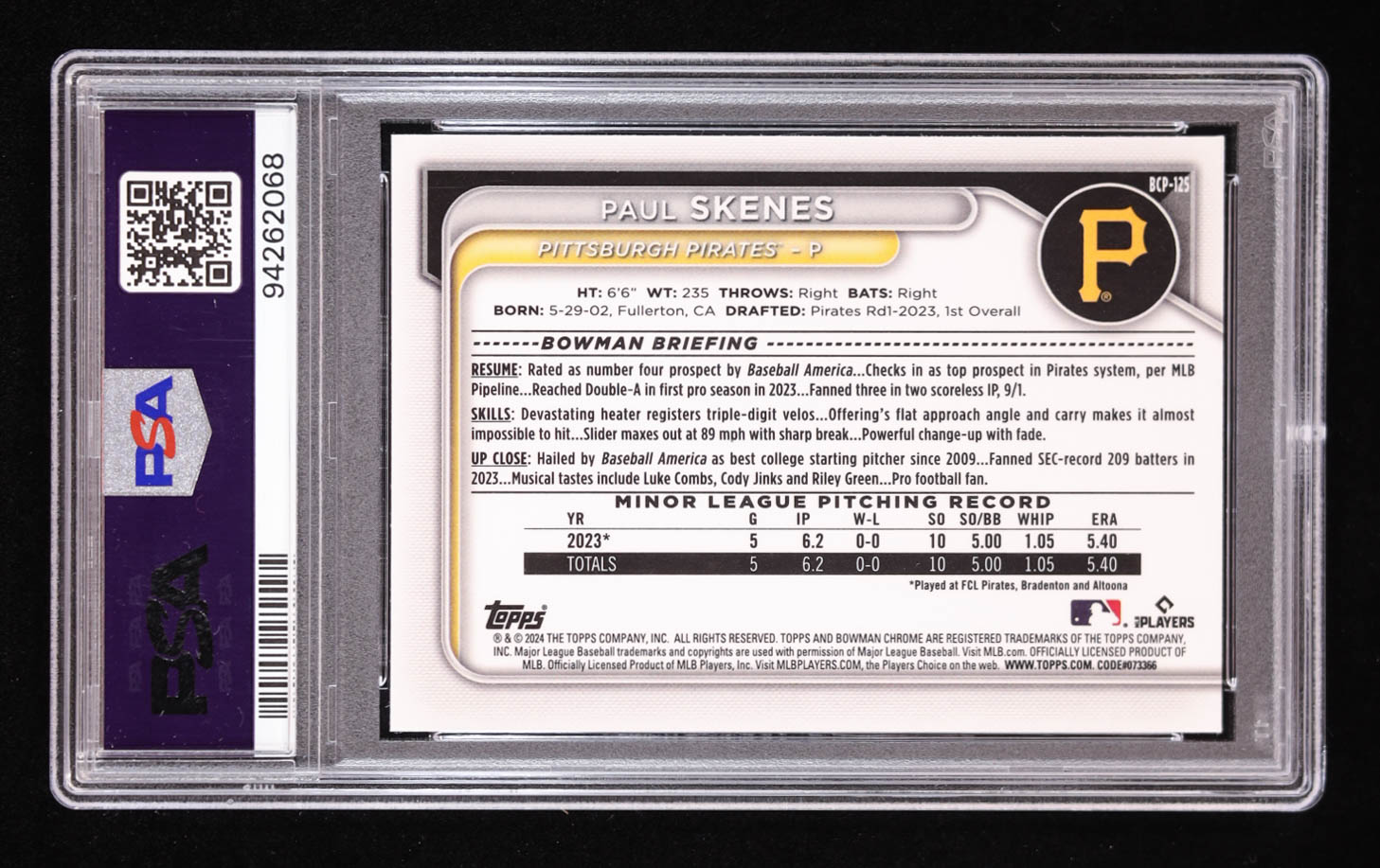 Paul Skenes 2024 Bowman Chrome Mega Box Prospects #BCP125 RC (PSA 10)