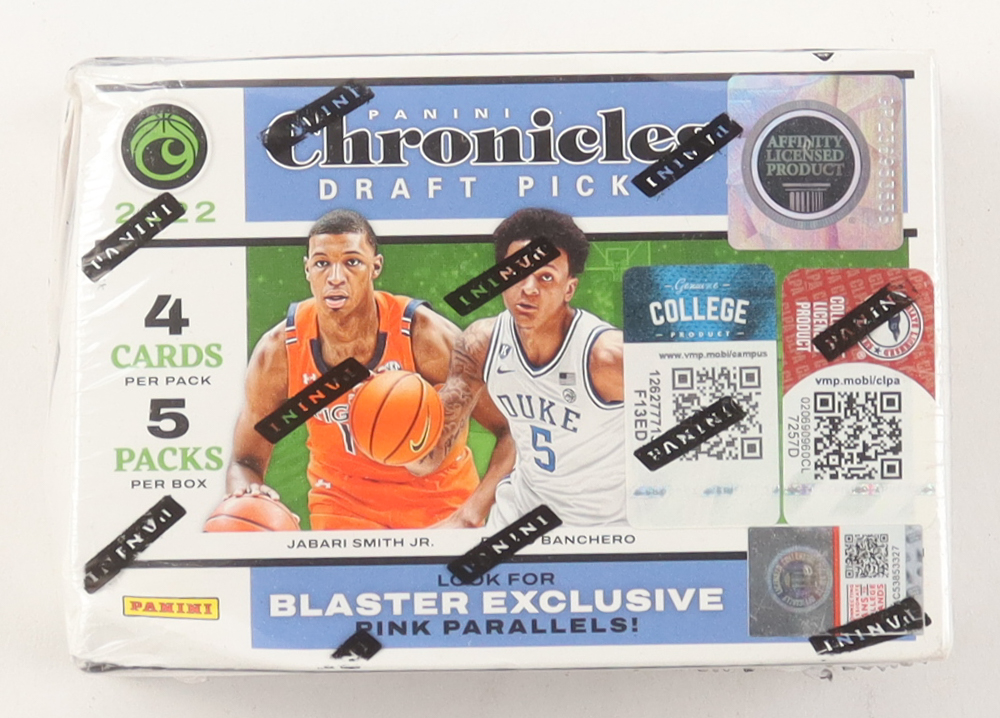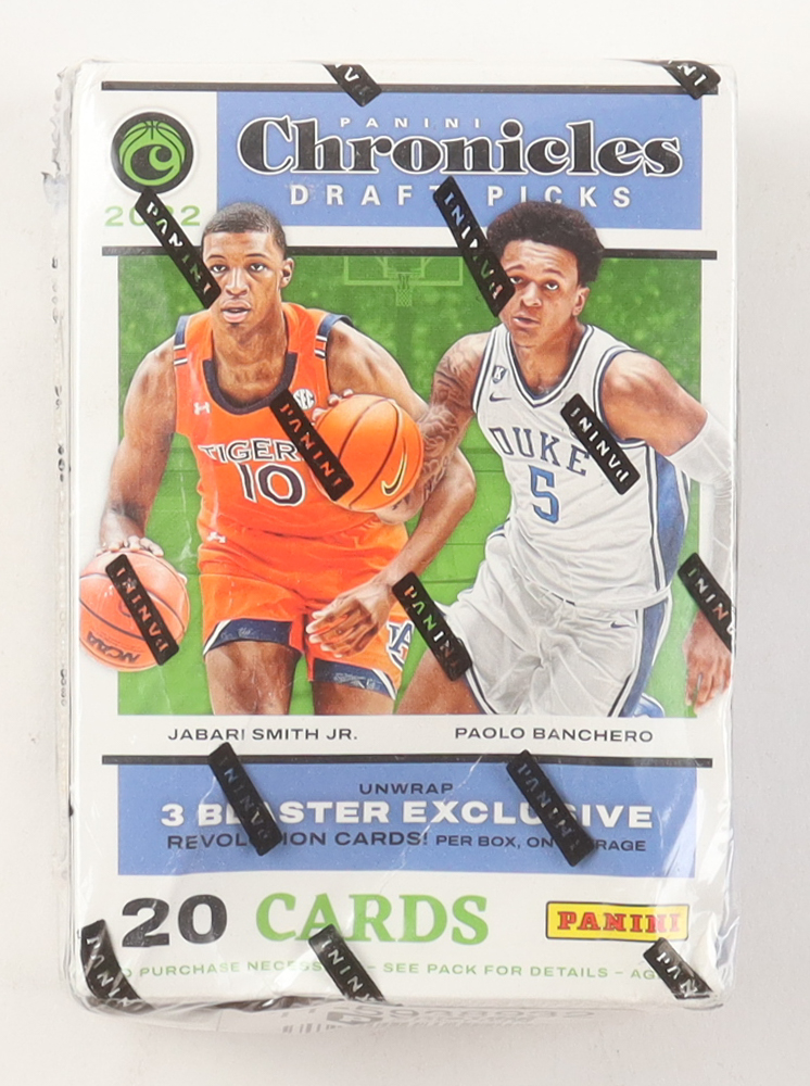Panini presents the 2022 NBA Chronicles Draft Picks blaster box! Each box may contain 3 blaster exclusive Revolution cards! Look for more than 10 different brands including Select, Mosaic and more! Be on the look out for blaster exclusive Pink Parallels!