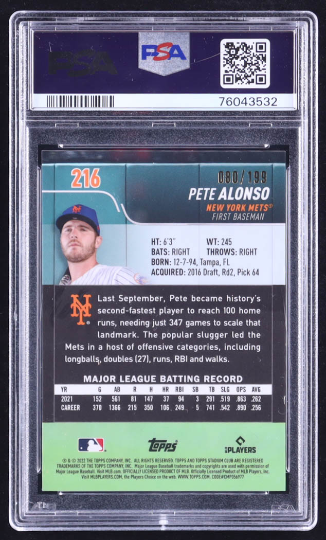 Pete Alonso 2022 Stadium Club Chrome Blue Refractors #216 (PSA 10)