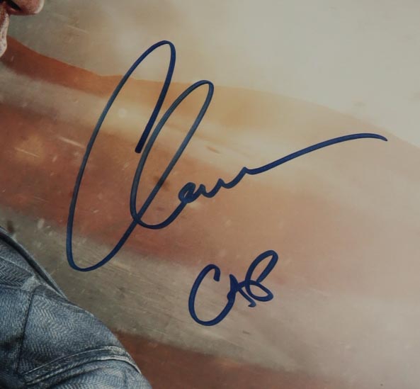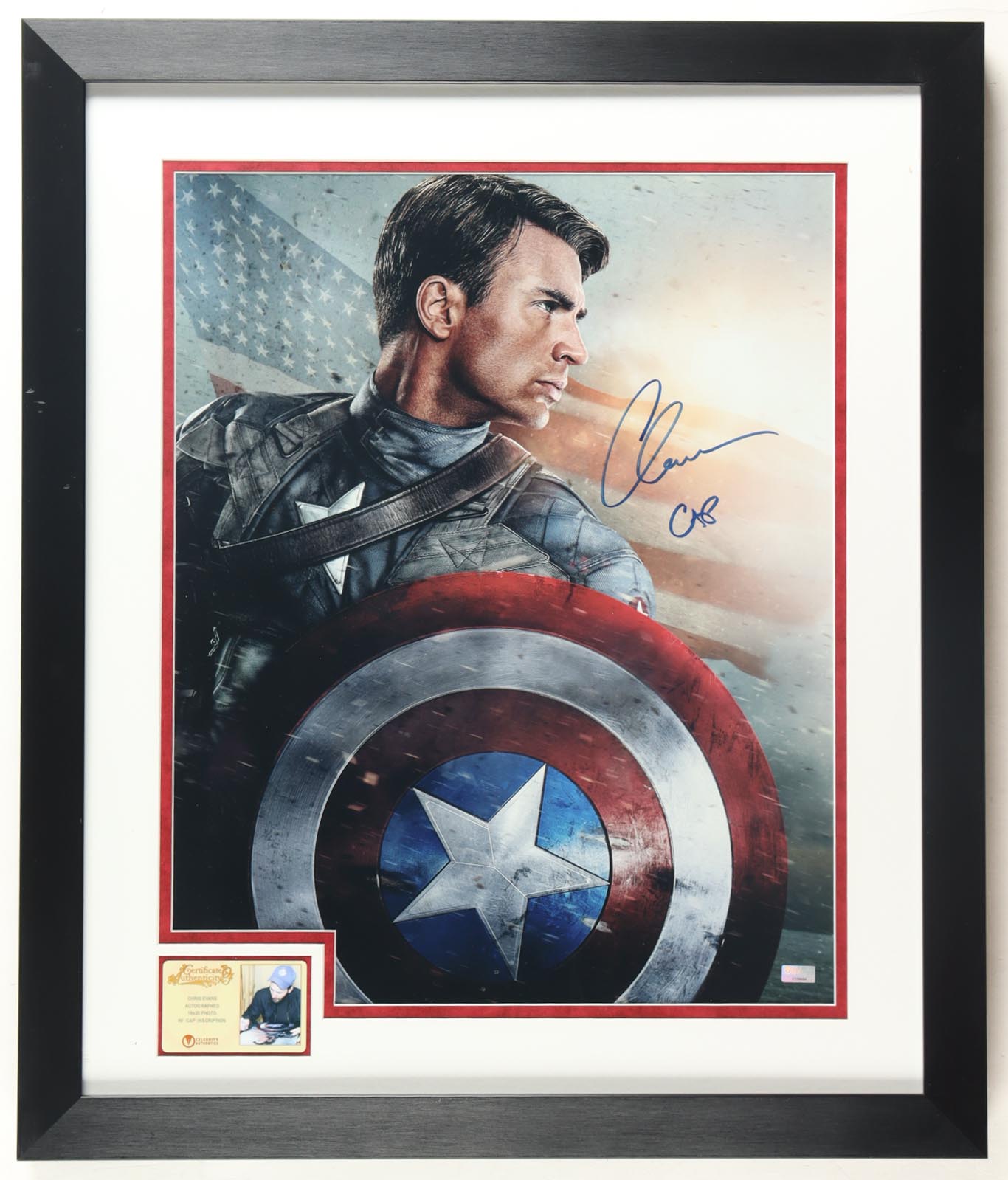 Custom frame measures 23” x 27” in size and features a photo that has been hand-signed and inscribed by Chris Evans.