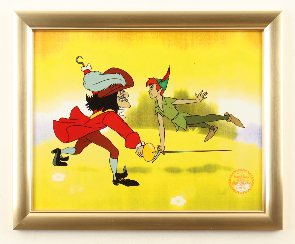 Custom frame measures approximately 13" x 16" in size and features a limited edition serigraph depicting "Peter Pan & Captain Hook". Please note, the display is unsigned and there is some scuffing on the frame.
