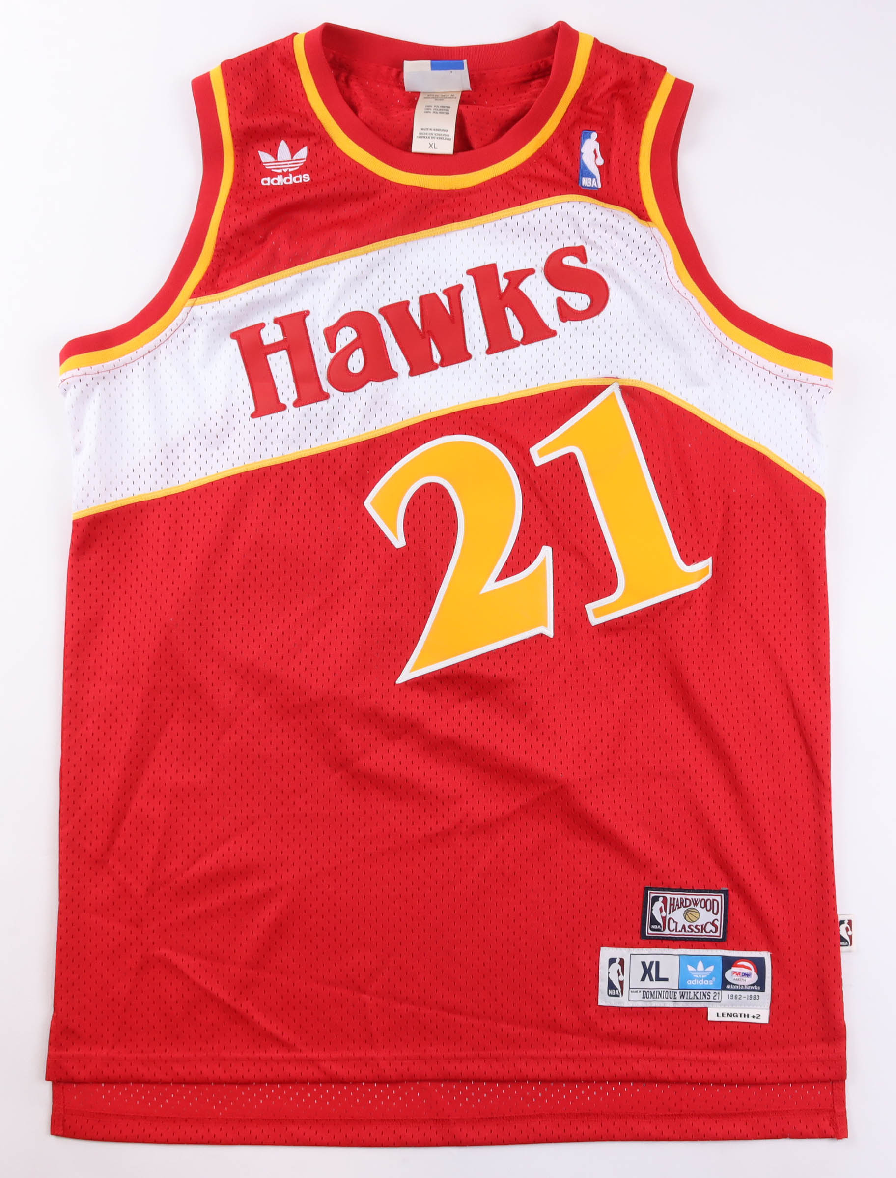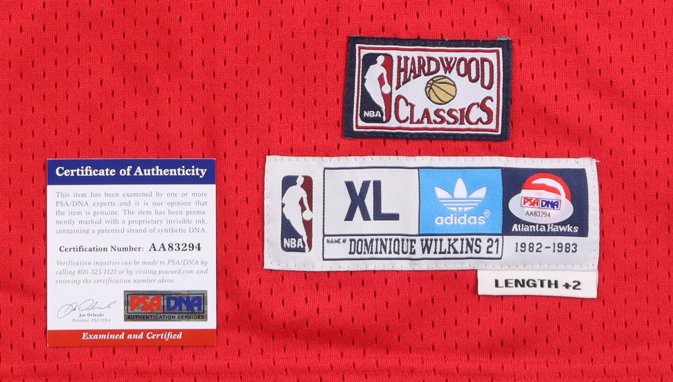 Adidas jersey. Everything is sewn on, size XL. Hand-signed and inscribed by Dominique Wilkins (HOF).
