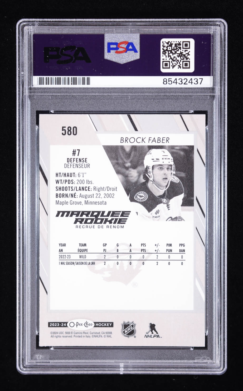 Brock Faber Signed 2023 O-Pee-Chee Marquee Rookie #580 (PSA)