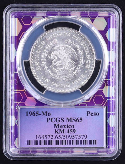 1965-Mo Mexico Silver Peso, KM-459 - Purple Trader Bea Core (PCGS MS65)