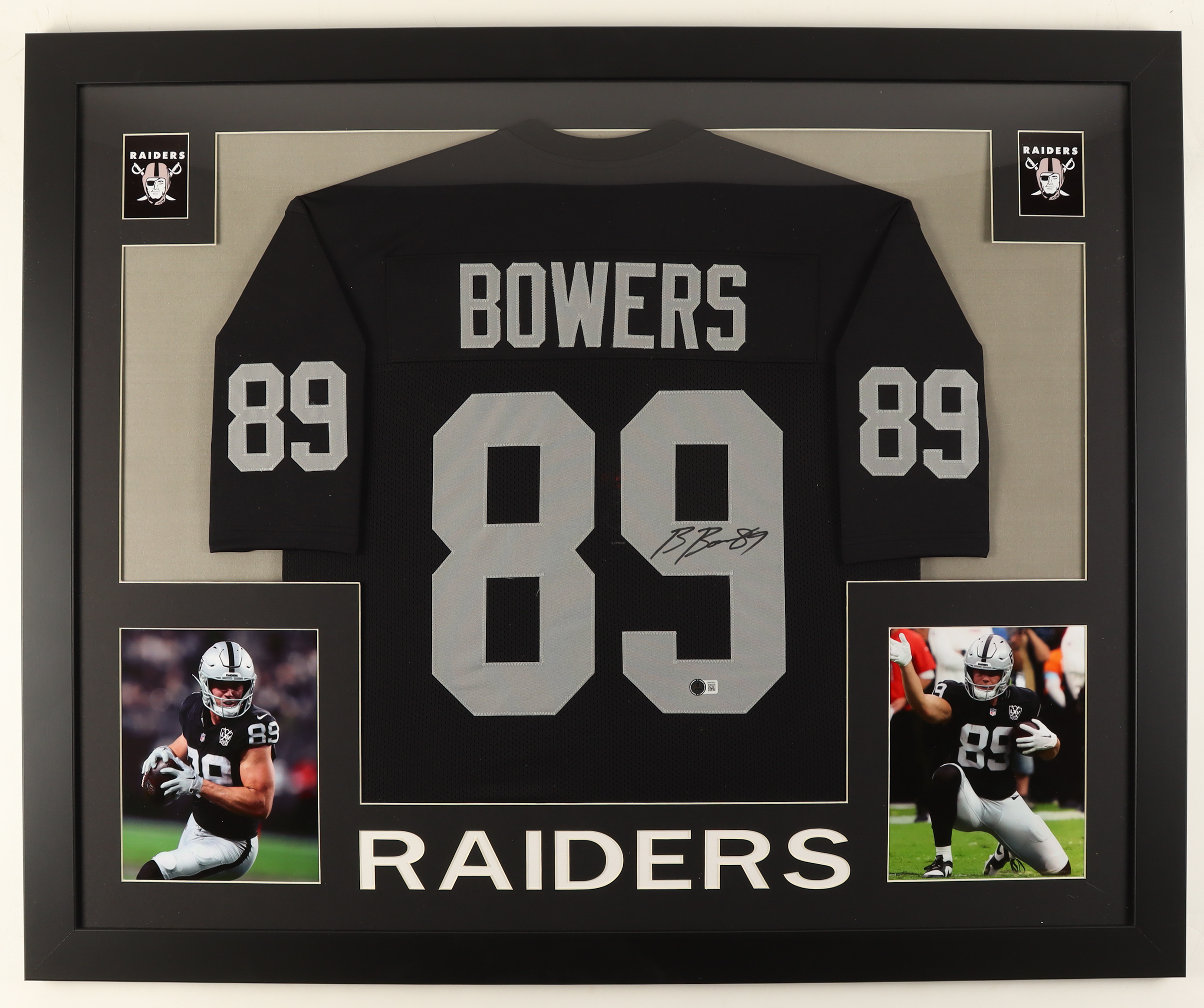 Custom frame measures approximately 35" x 43" in size and features a jersey that has been hand-signed by Brock Bowers. Please note that the 8" x 10" photos may be in reverse order.