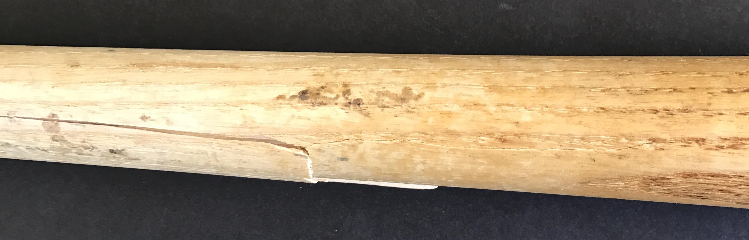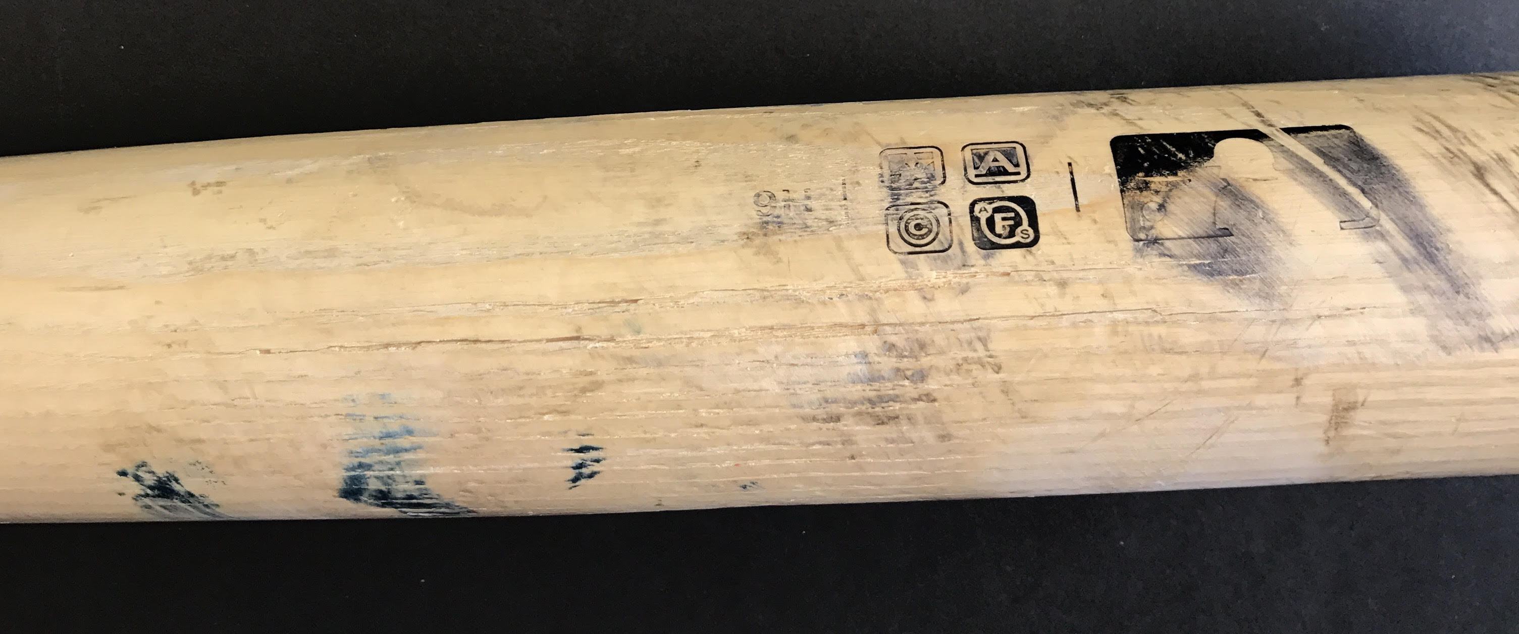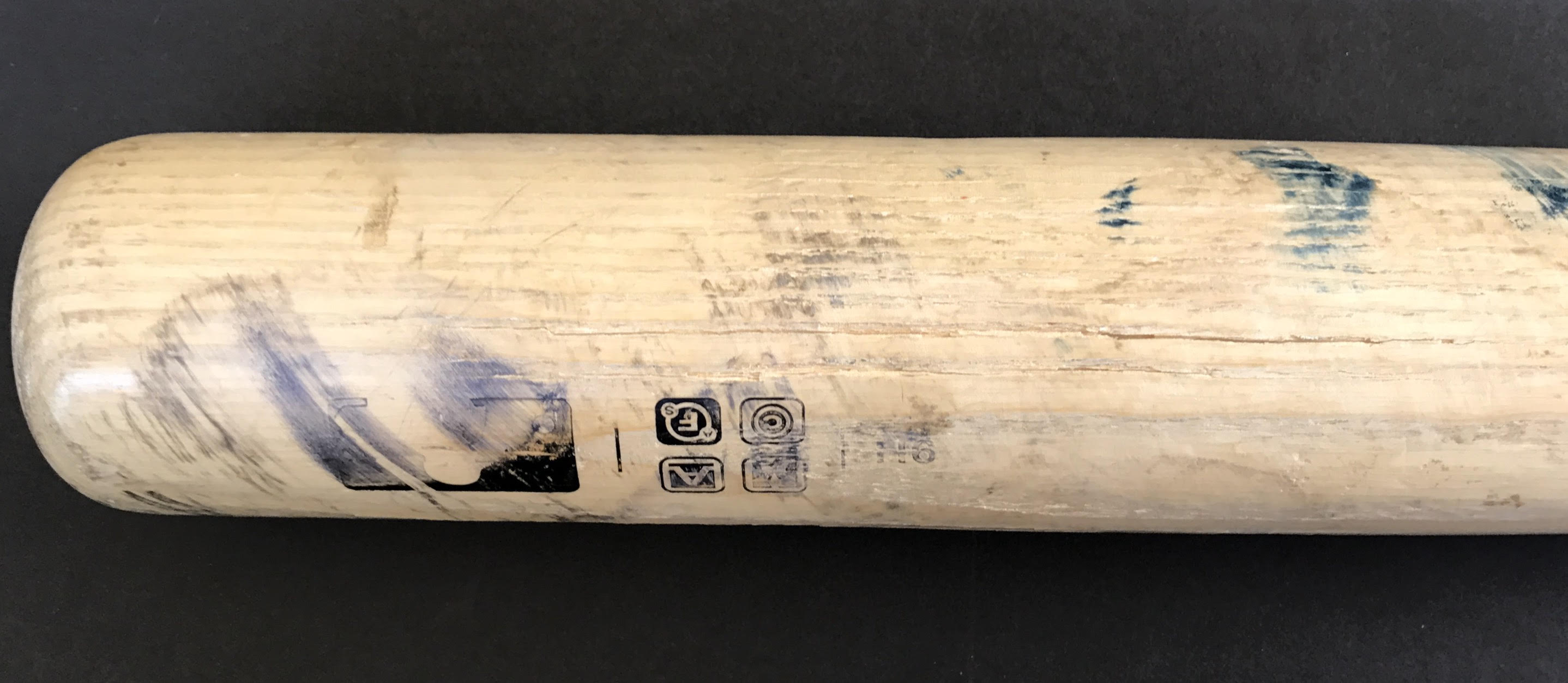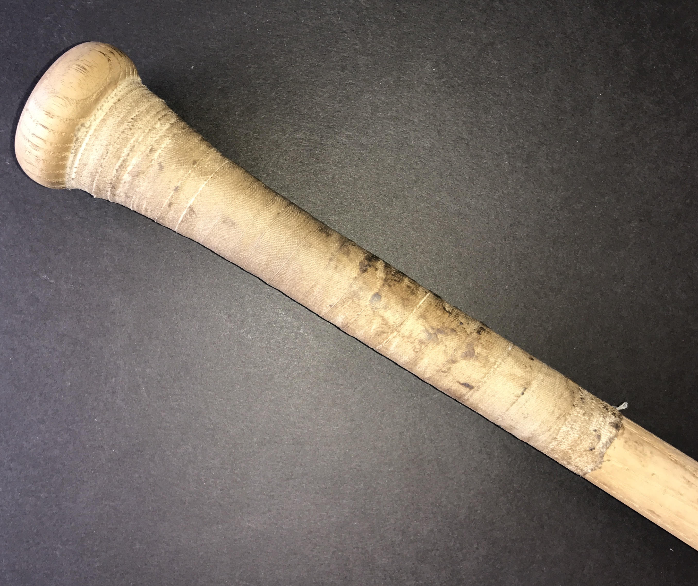 The bat shows incredible game usage with bat marks, cleat marks and more. The bat is cracked on the handle and barrel but is very much in tact.