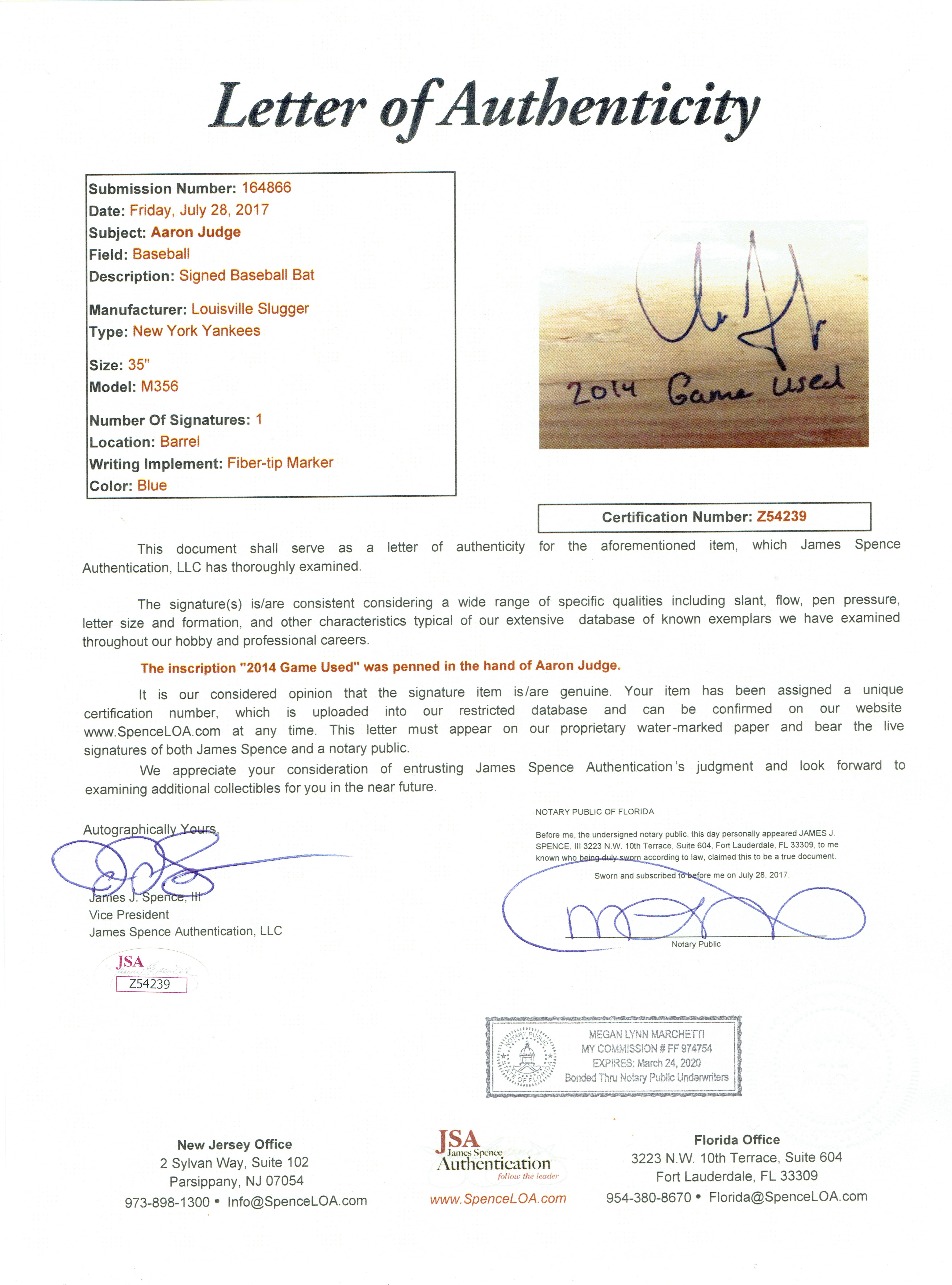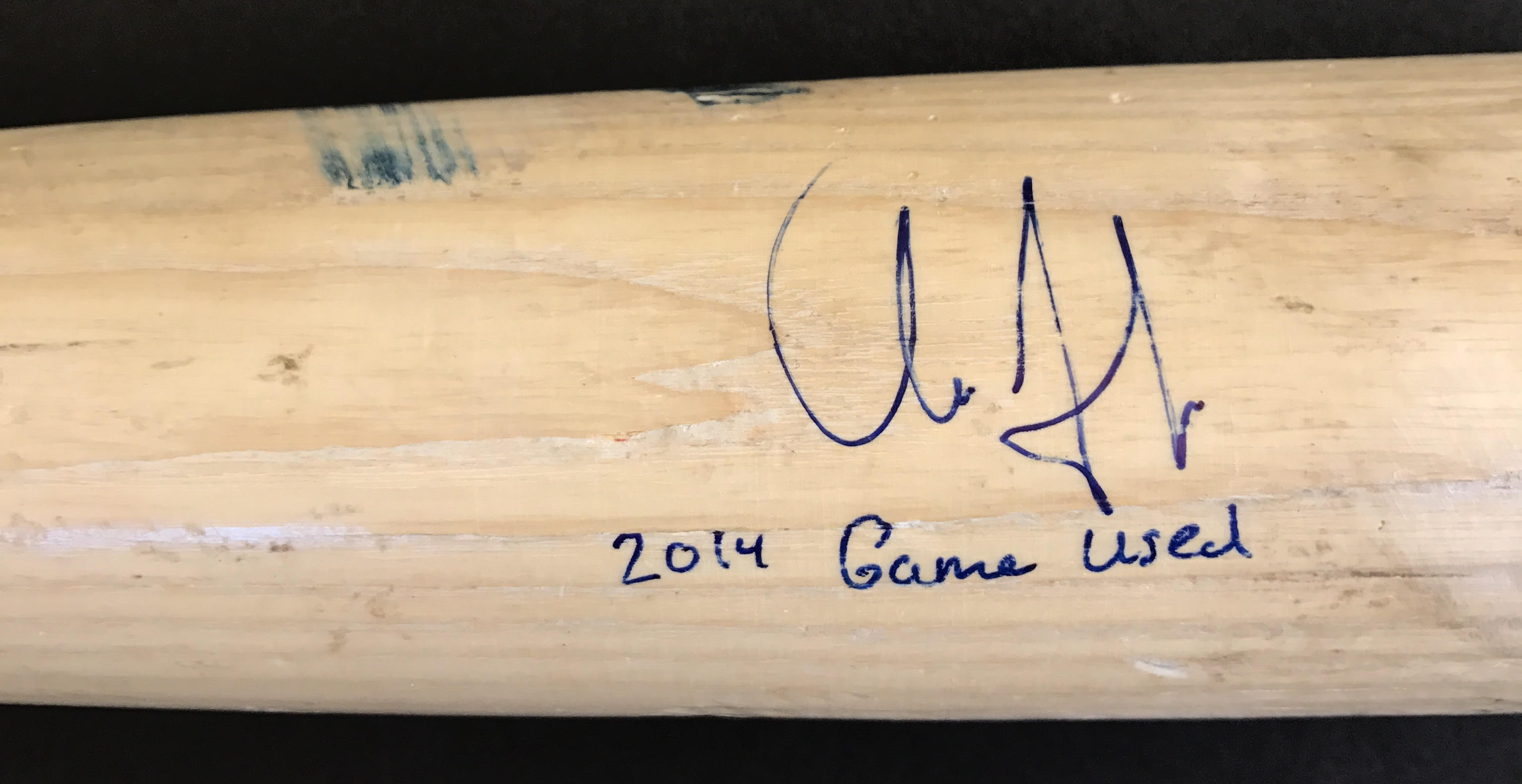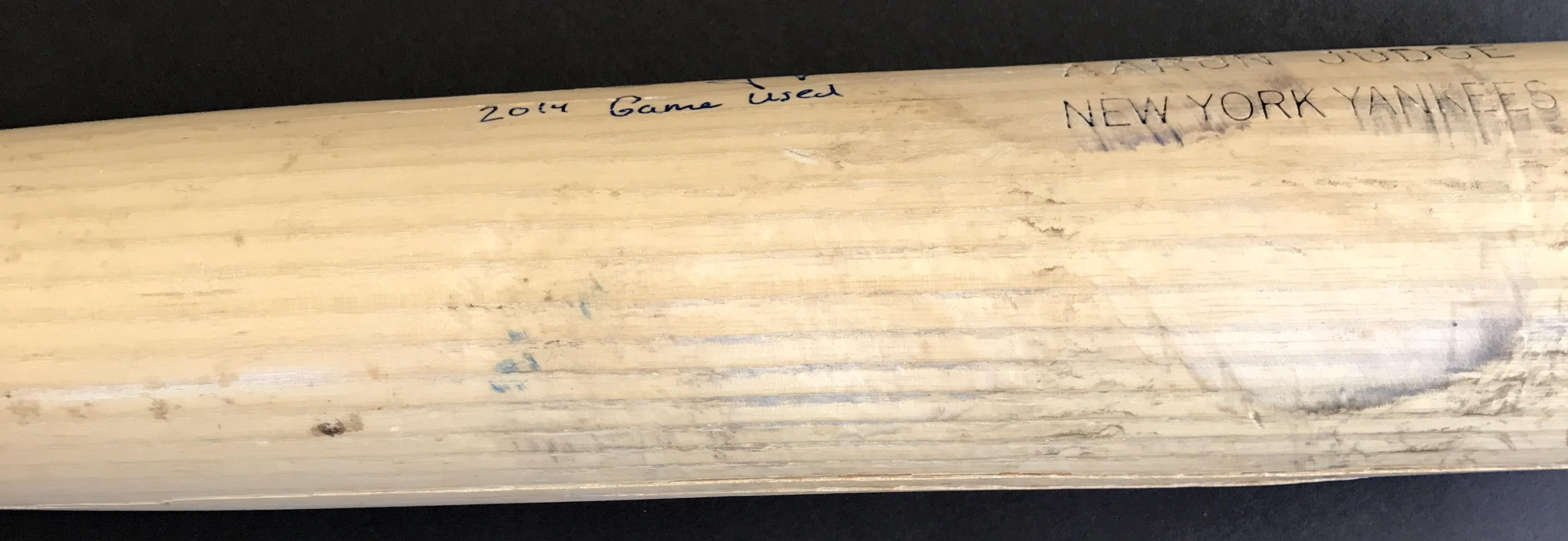This Louisville Slugger Model M356 baseball bat was game-used, hand-signed and inscribed "2014 Game Used" in blue felt tip pen by Aaron Judge (Yankees).
