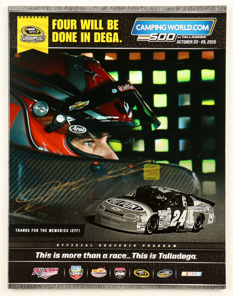 October 23-25, 2015 "Campingworld.com" Talladega 500 Souvenir Program has been hand-signed on the front cover by Jeff Gordon (HOF). Please note, the signature is scuffed and faded.