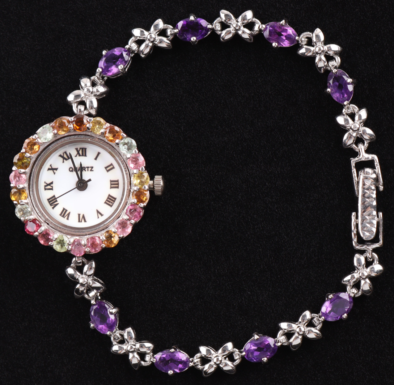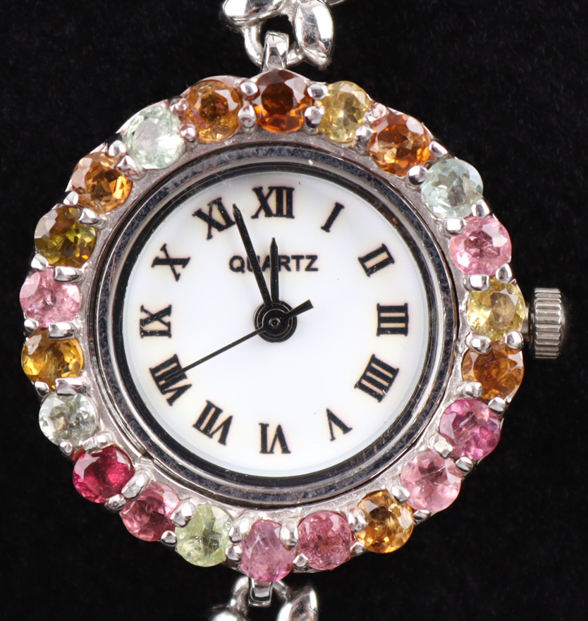 Ladies Amethyst & Tourmaline Quartz Watch. Stainless Steel Case. Quartz Movement. White Face With Roman Numerals. Rhodium Over Sterling Silver Bracelet And Bezel. Measures 7 Inches In Length. Contains The Following: