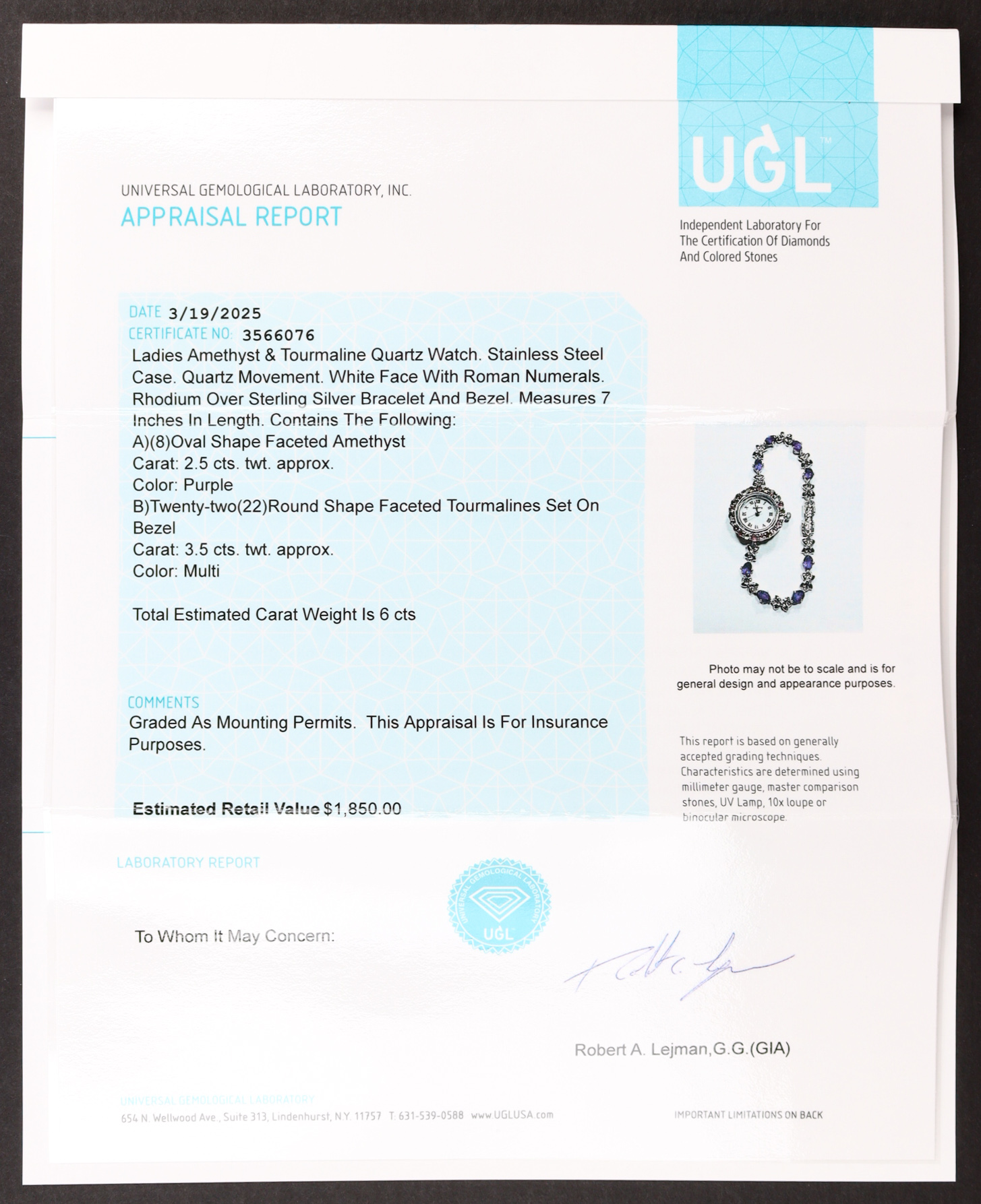 This piece includes paperwork from Universal Gemological Laboratory (UGL)