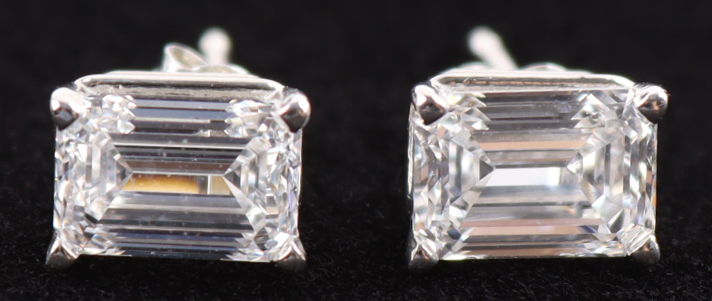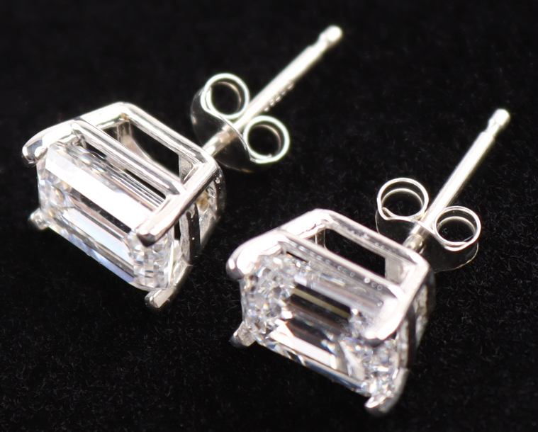 One Pair Emerald Cut Diamond Stud Earrings. Set In Sterling