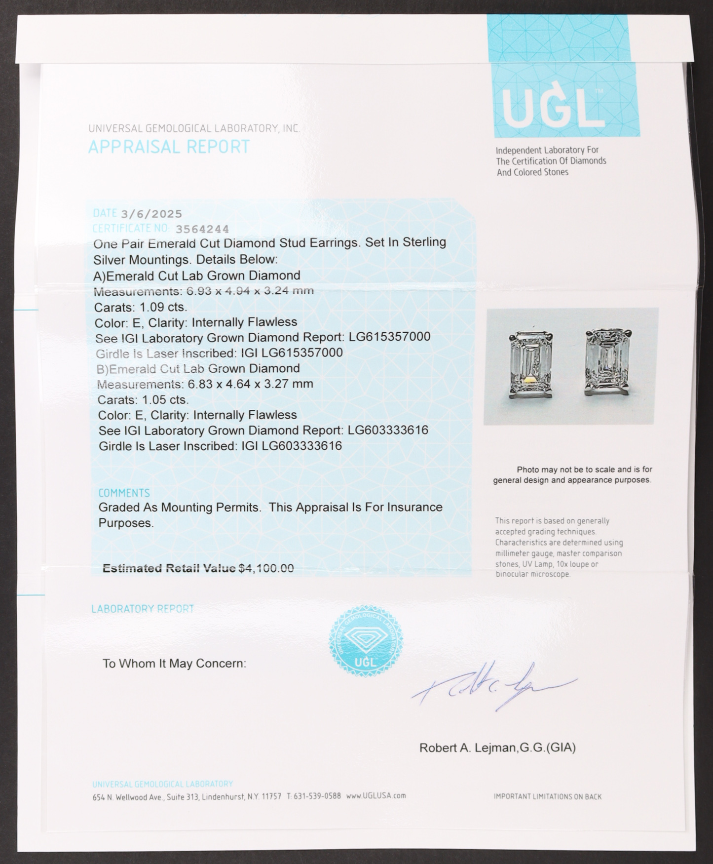 New 2.14 Carats Lab Grown Pair of Internally Flawless Diamond Stud Earrings E | Estimated Retail Value: $4,100 (UGL & IGI)