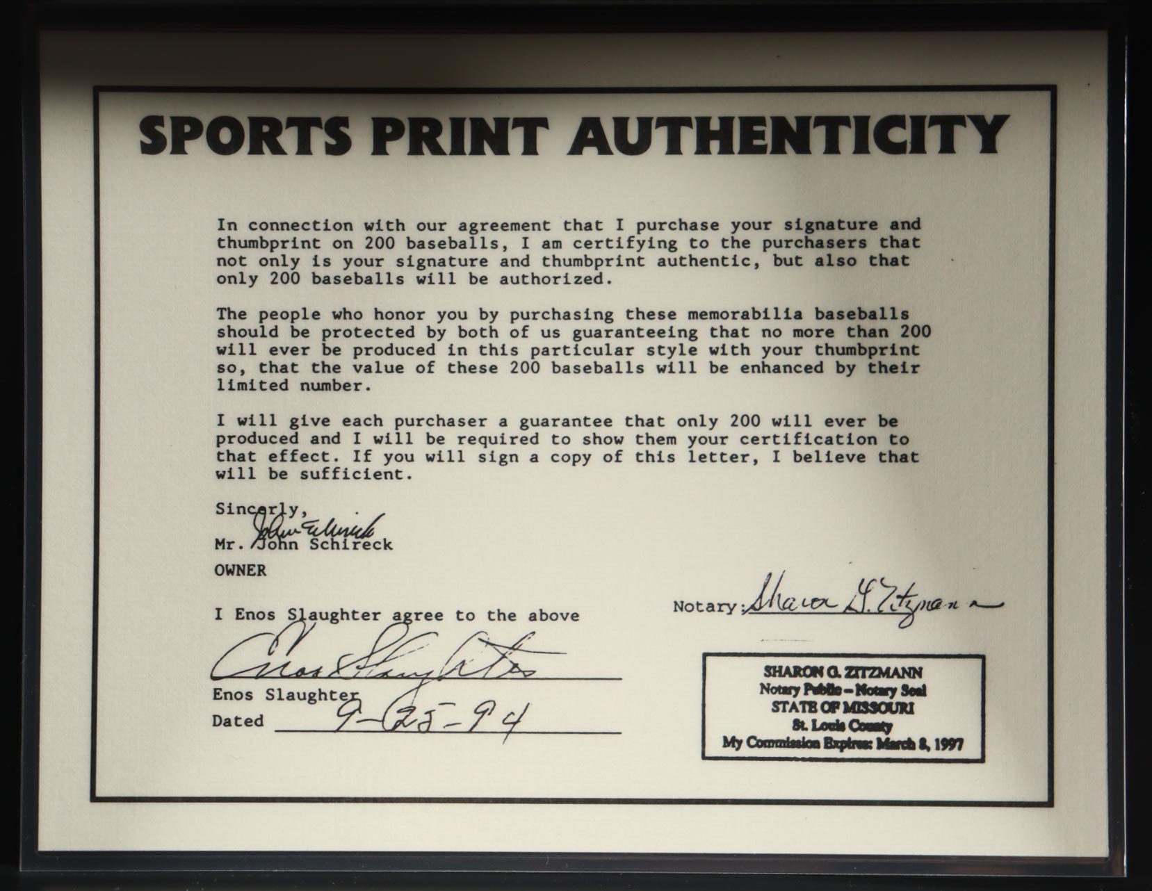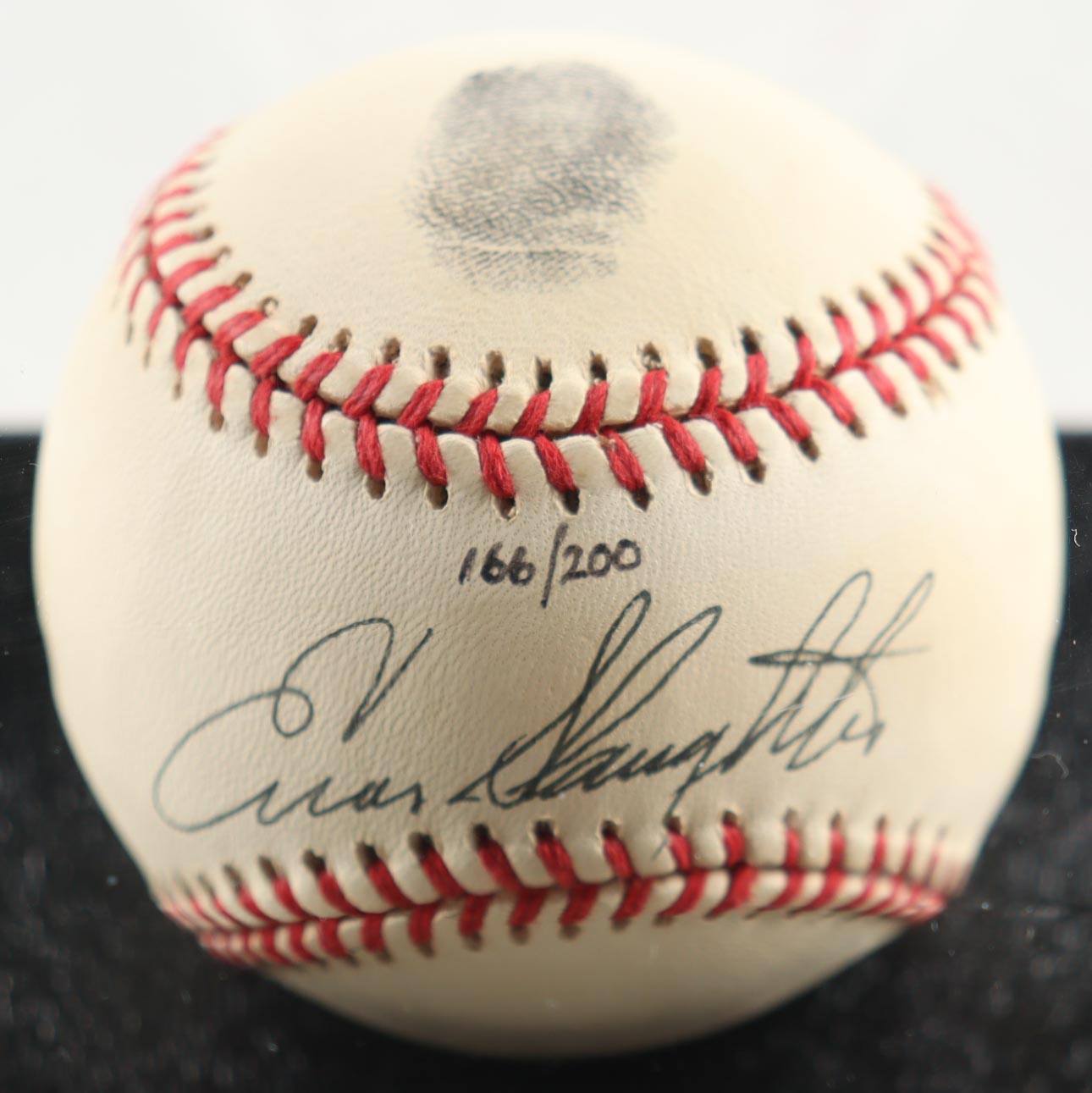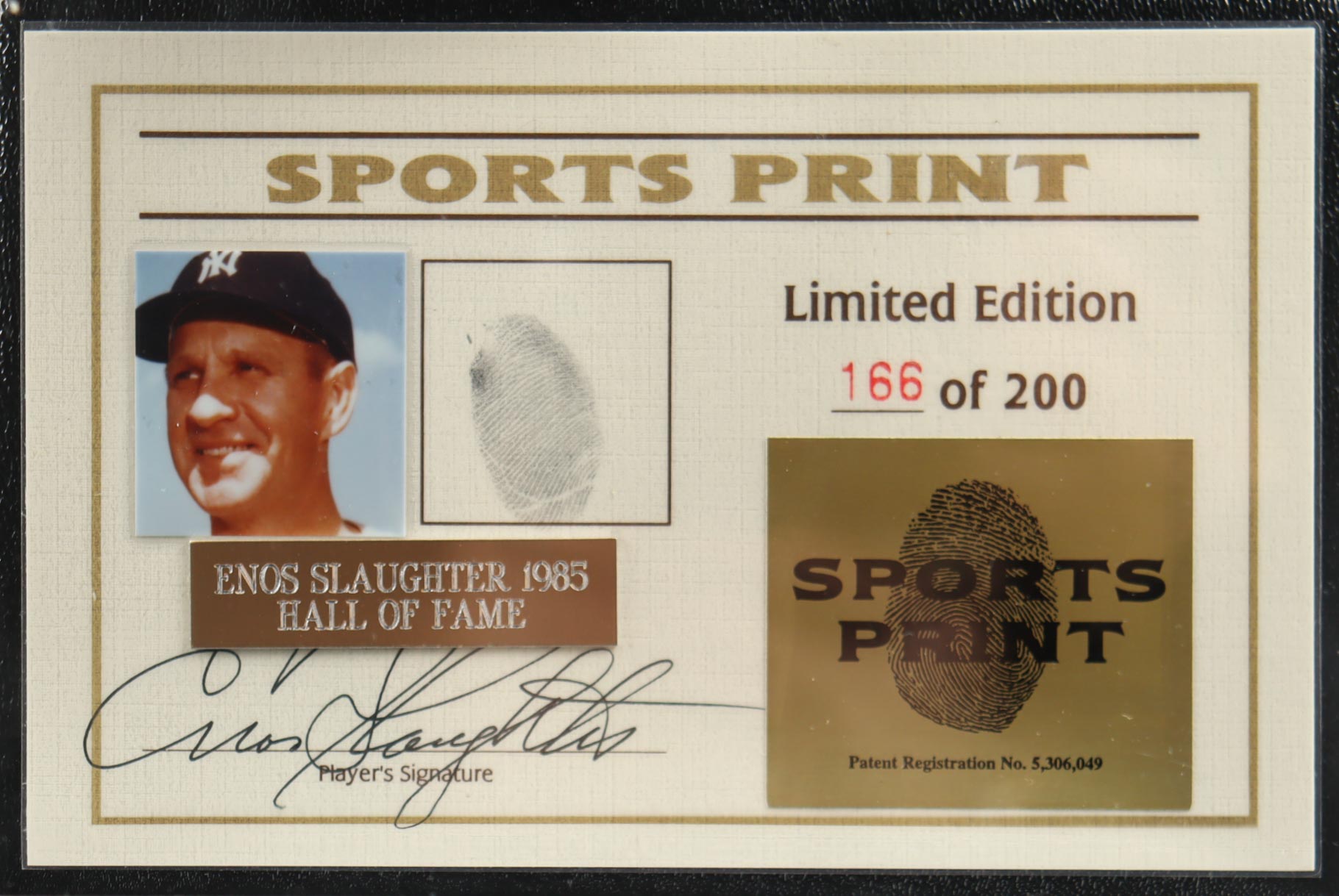 Rawlings Official National League baseball display. Hand-signed by Enos Slaughter (D. 2002, New York Yankees, HOF). The item is limited edition and the item you receive will be hand-numbered #166/200.