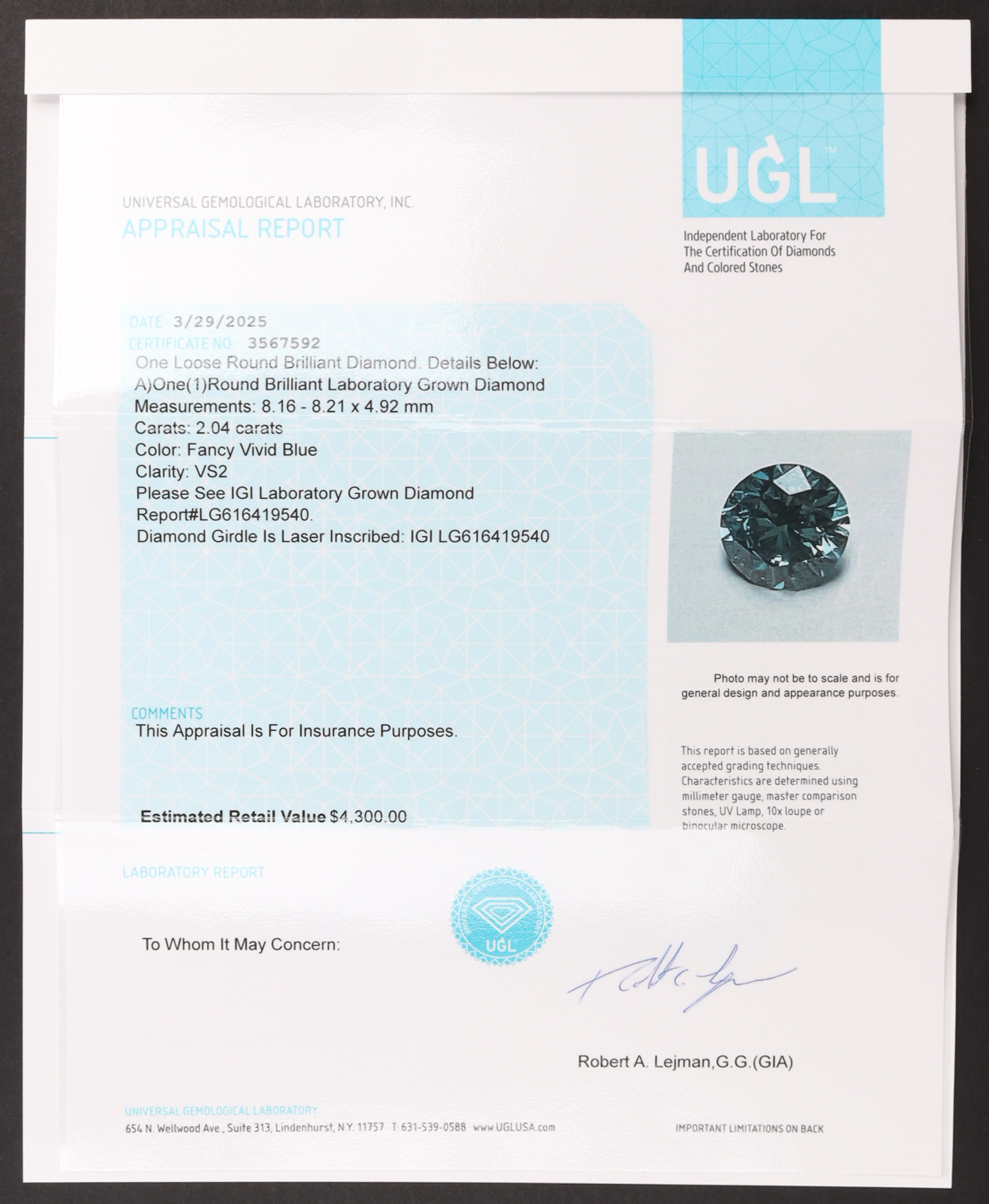 New 2.04 Carat Loose Lab Grown Fancy Vivid Blue Diamond VS2 | Estimated Retail Value: $4,300 (UGL & IGI)