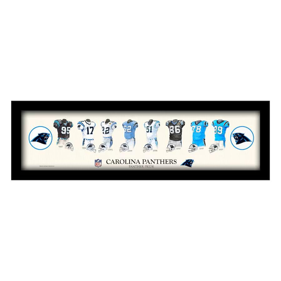 Custom frame measures 8" x 26" in size and features Carolina Panthers "Heritage Uniforms" photo.