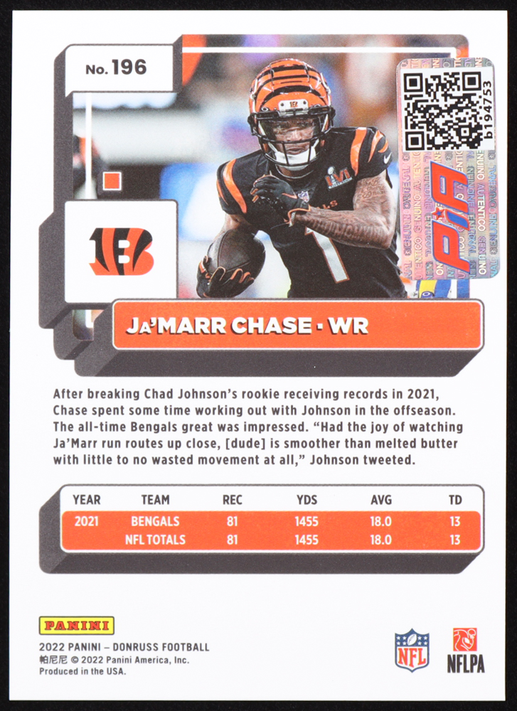 Ja'Marr Chase Signed 2022 Donruss Press Proof Premium #196 (PIA)