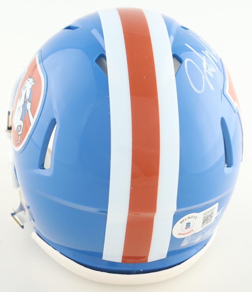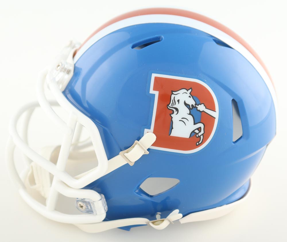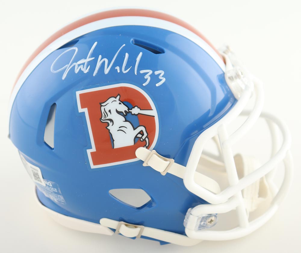 Riddell Denver Broncos Throwback Speed mini helmet. Hand-signed by Javonte Williams.