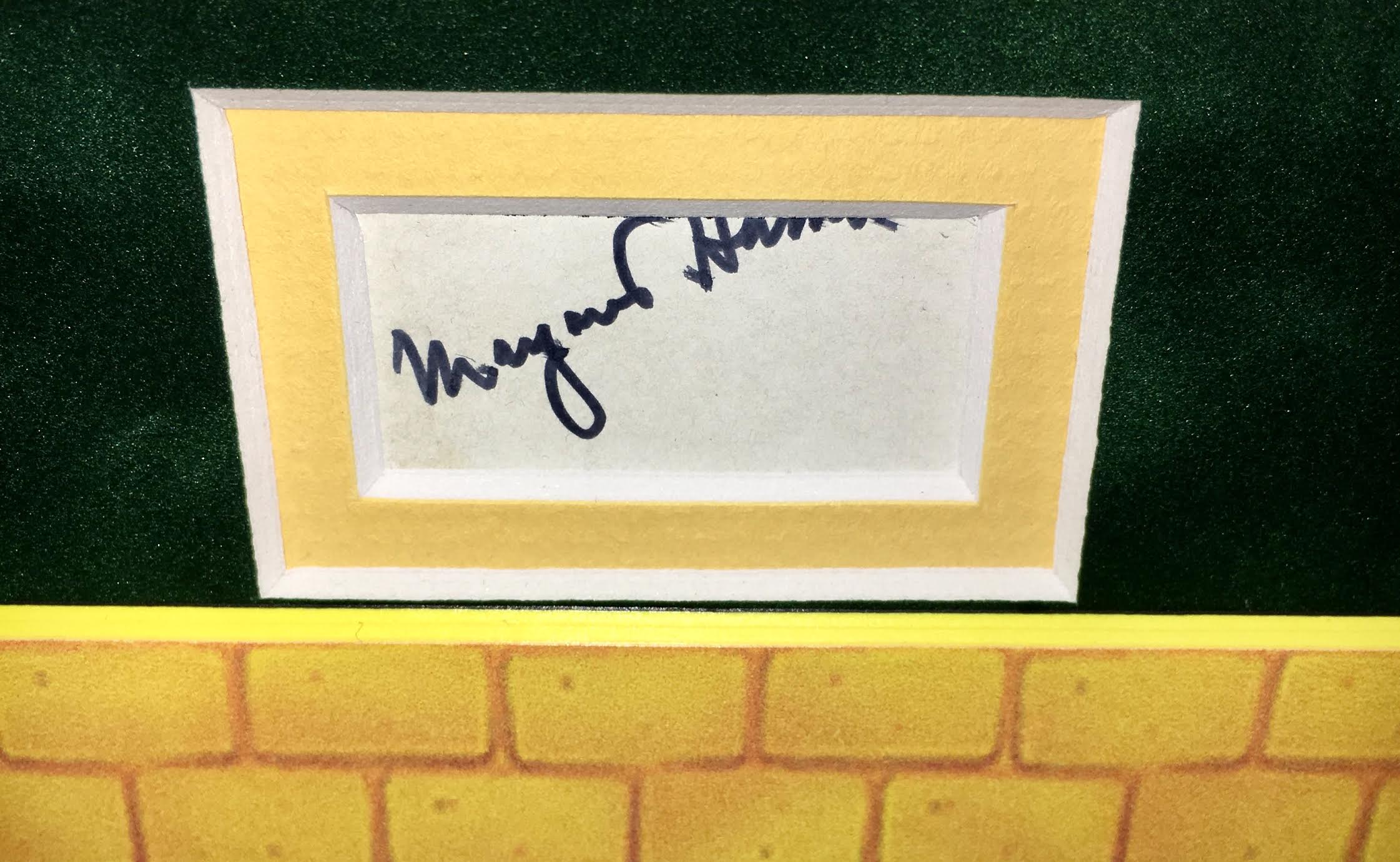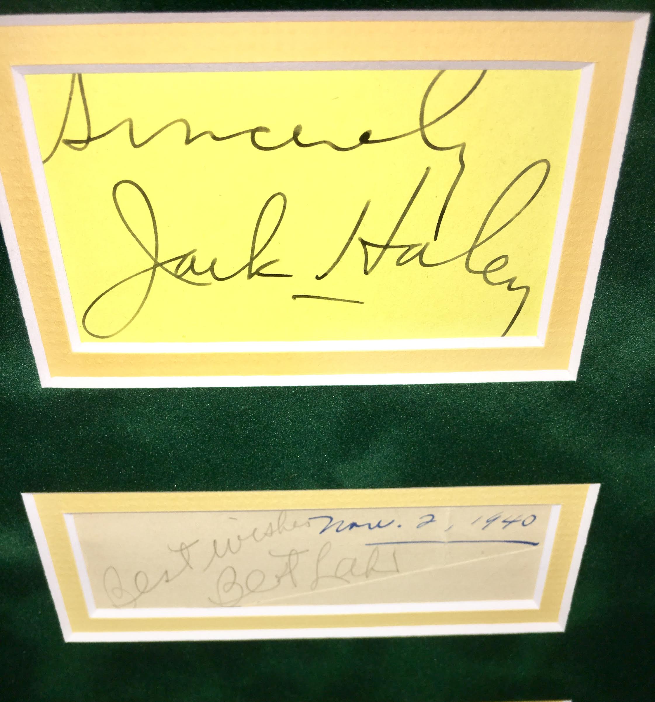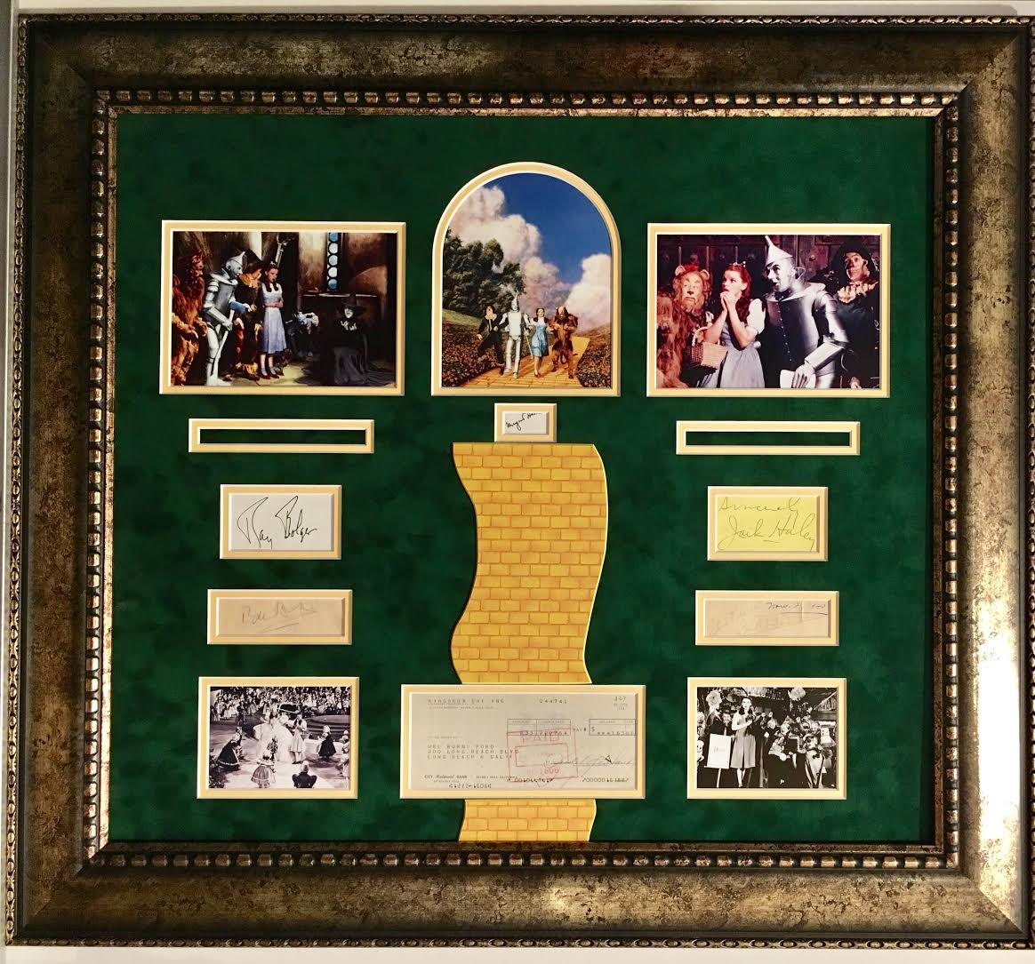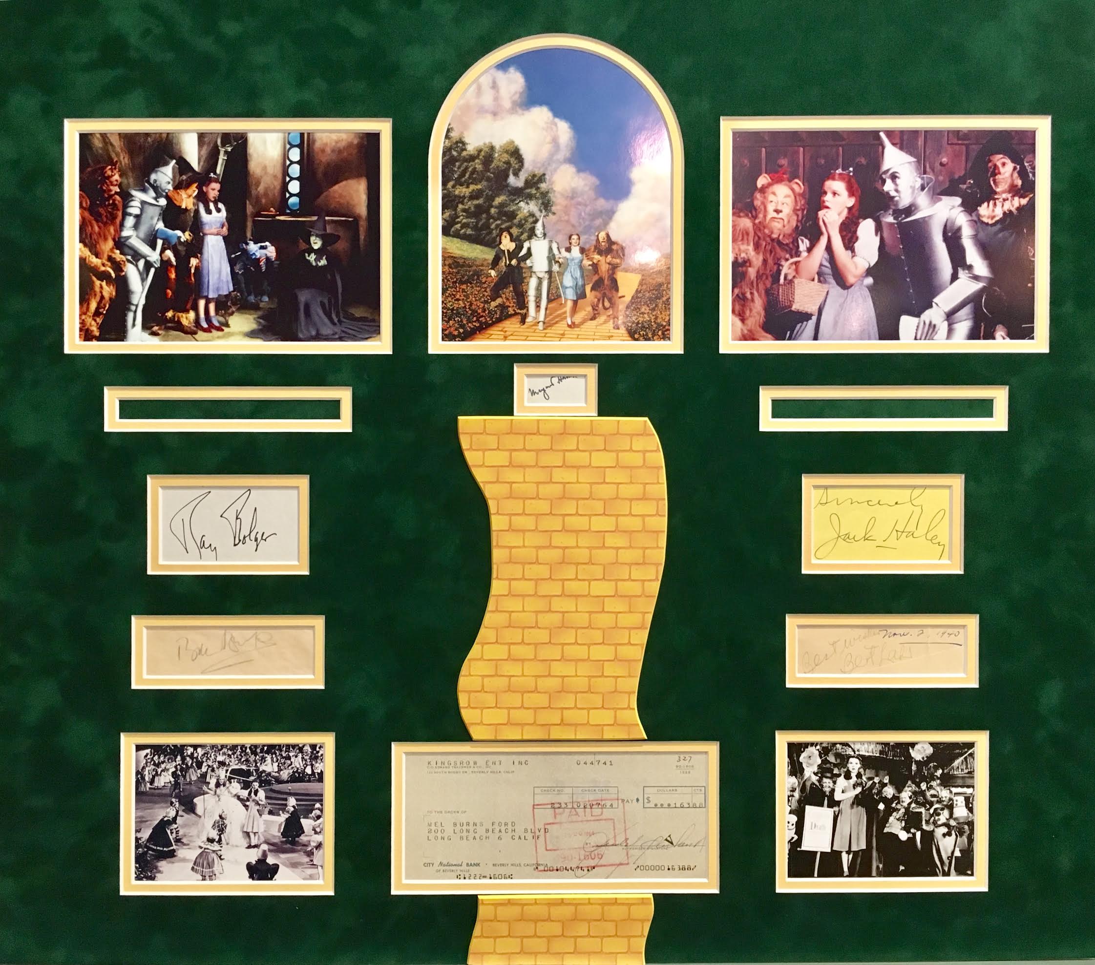 Custom framed photo and signature display featuring the hand signatures from the cast of the classic 1939 motion picture, "The Wizard Of Oz": Judy Garland, Ray Bolger, Jack Haley, Bert Lahr, Billie Burke, and Margaret Hamilton. Professionally assembled with suede acid-free mats and premium clear glass to an overall 29" x 28".
