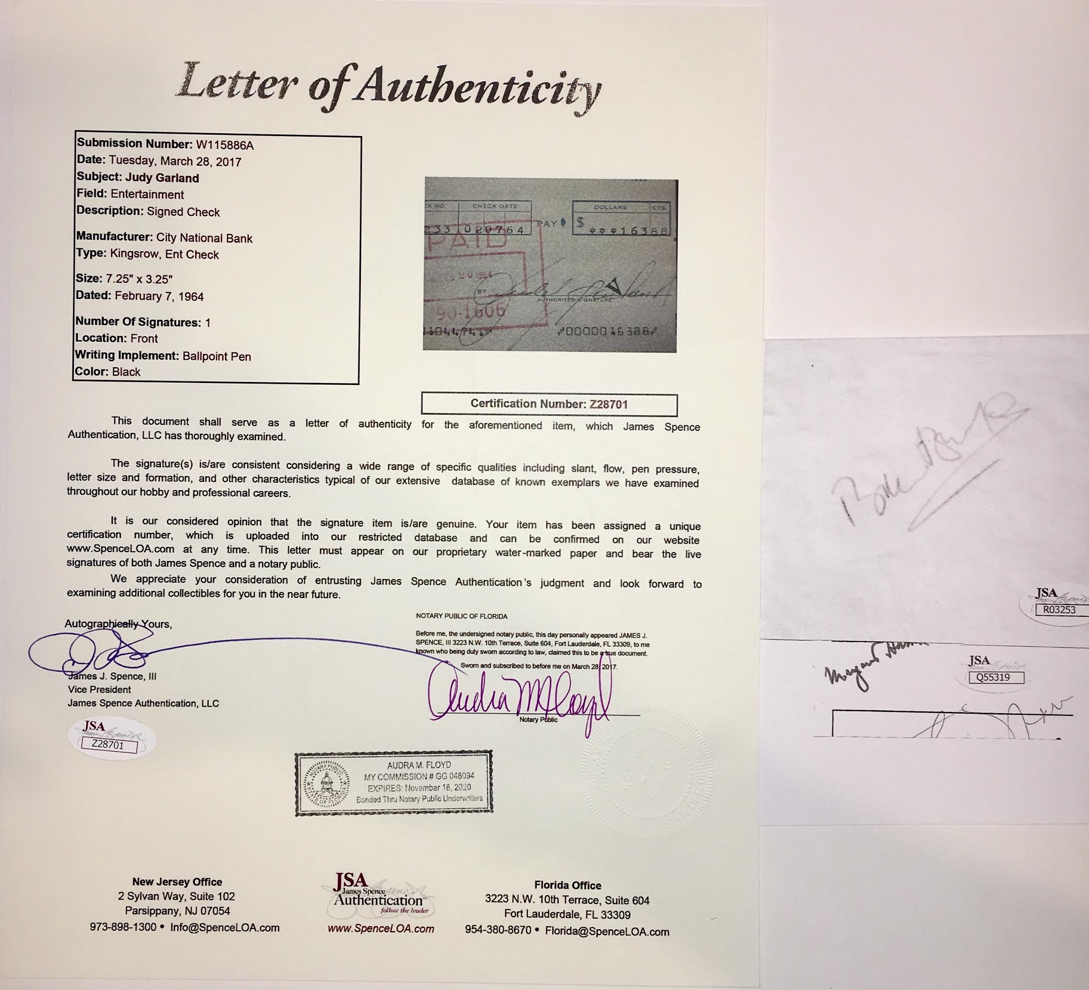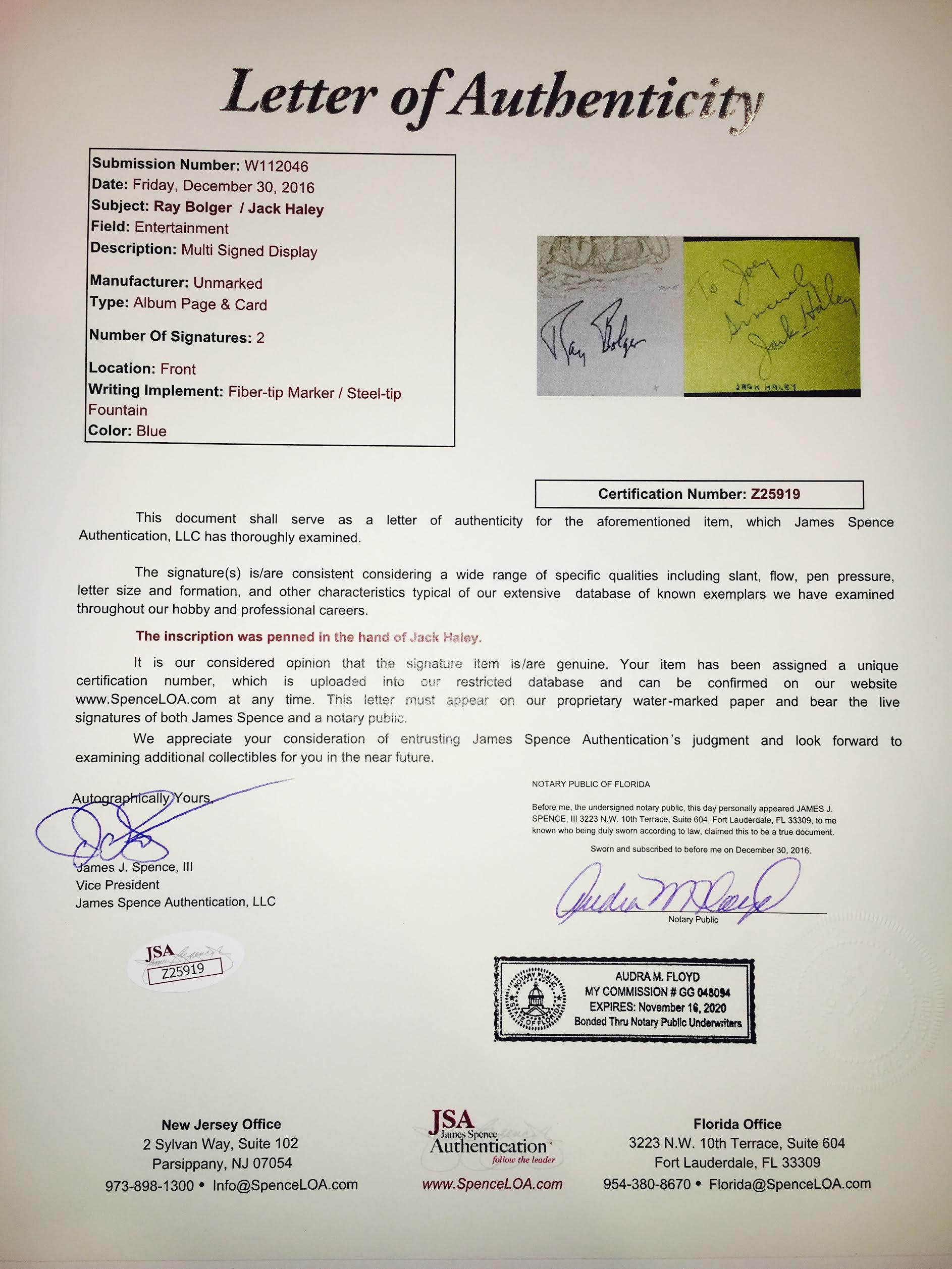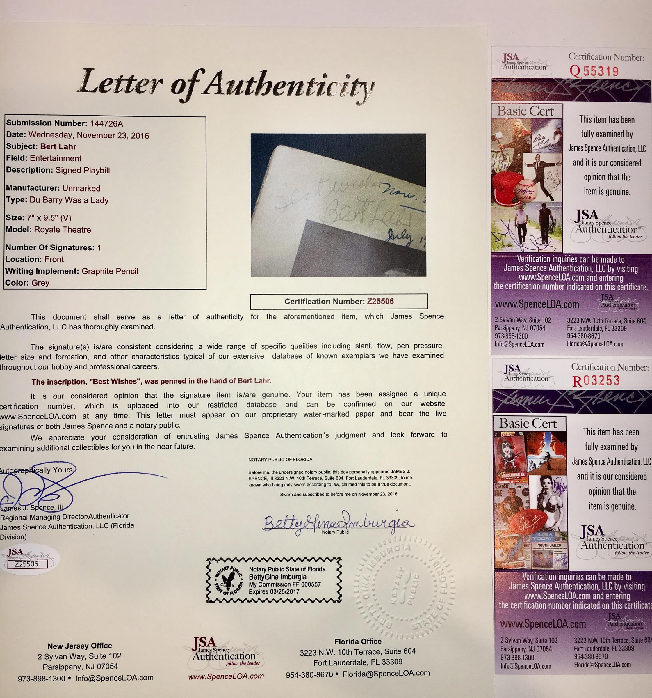 The lot / autograph(s) includes an official James Spence Authentication (JSA) hologram, matching COA, and LOA for authenticity purposes.