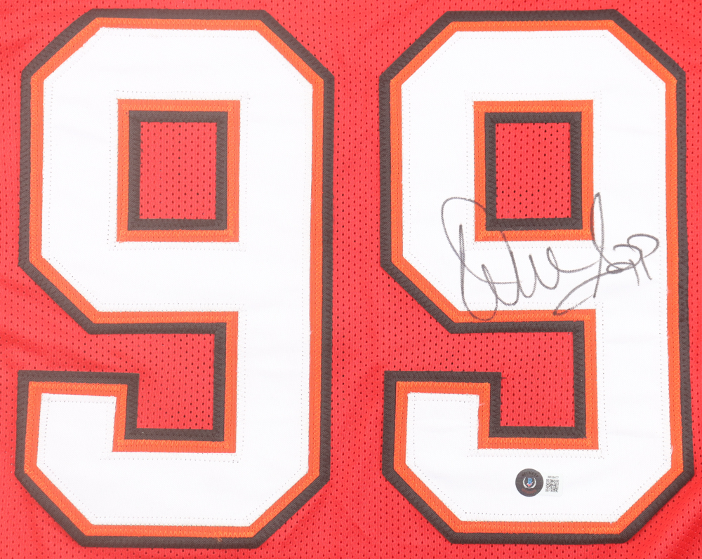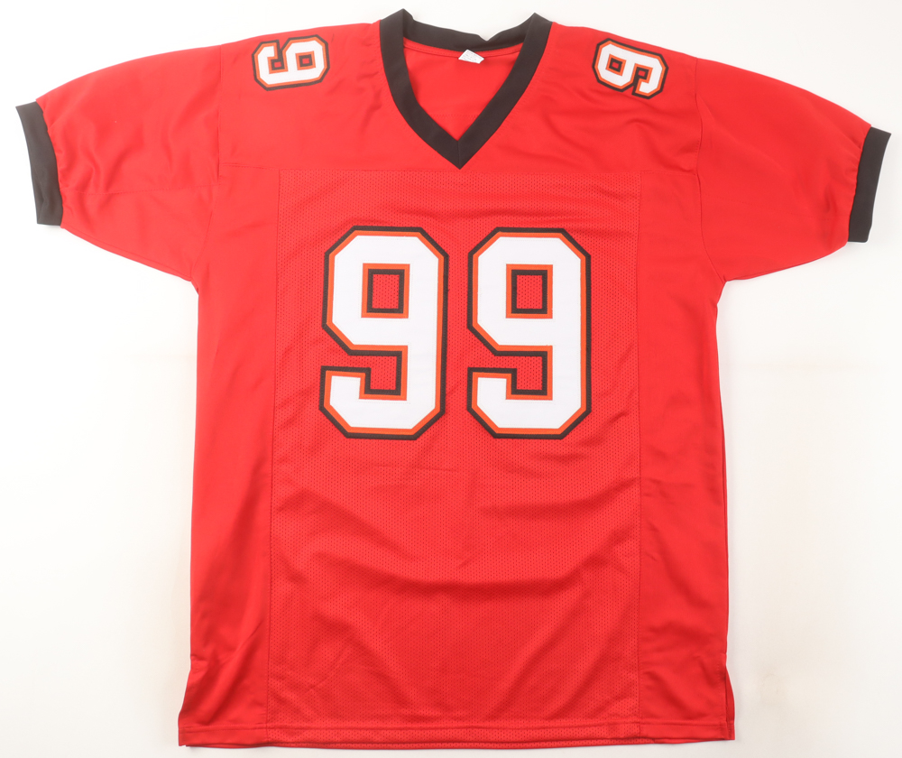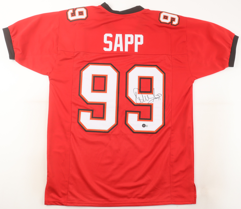 Custom jersey with everything sewn on, size XL. Hand-signed by Warren Sapp (Tampa Bay Buccaneers, HOF).