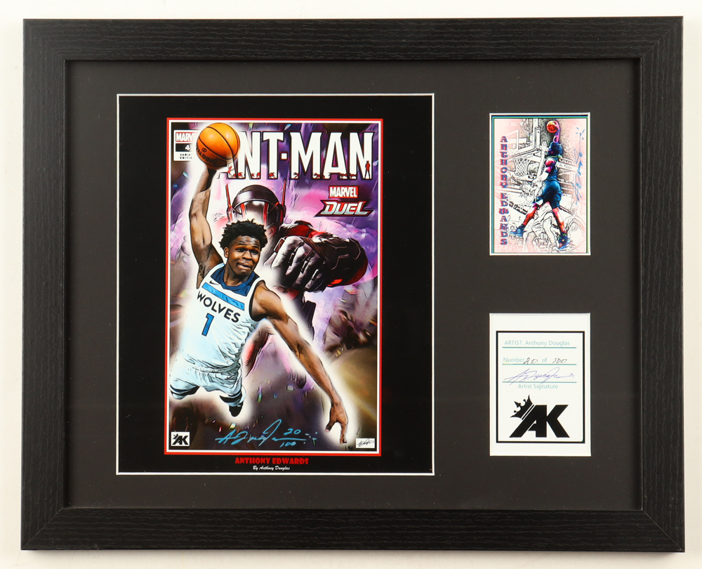 Custom frame measures approximately 12.5" x 15.5" in size and features a lithograph of Anthony Edwards (Minnesota Timberwolves) that has been hand-signed by the artist, Anthony Douglas. The display is limited edition and has been numbered #20/100.