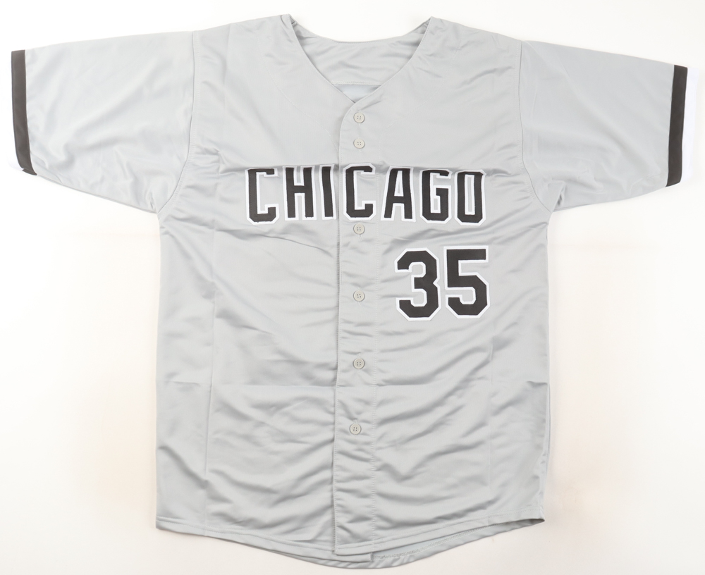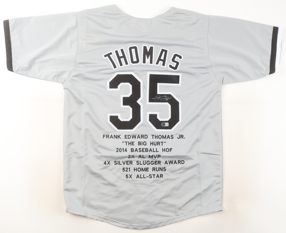 Custom jersey with everything sewn own, size XL. Hand-signed by Frank Thomas (HOF). Thomas's career stats have been stitched on the reverse side of the jersey underneath the number.