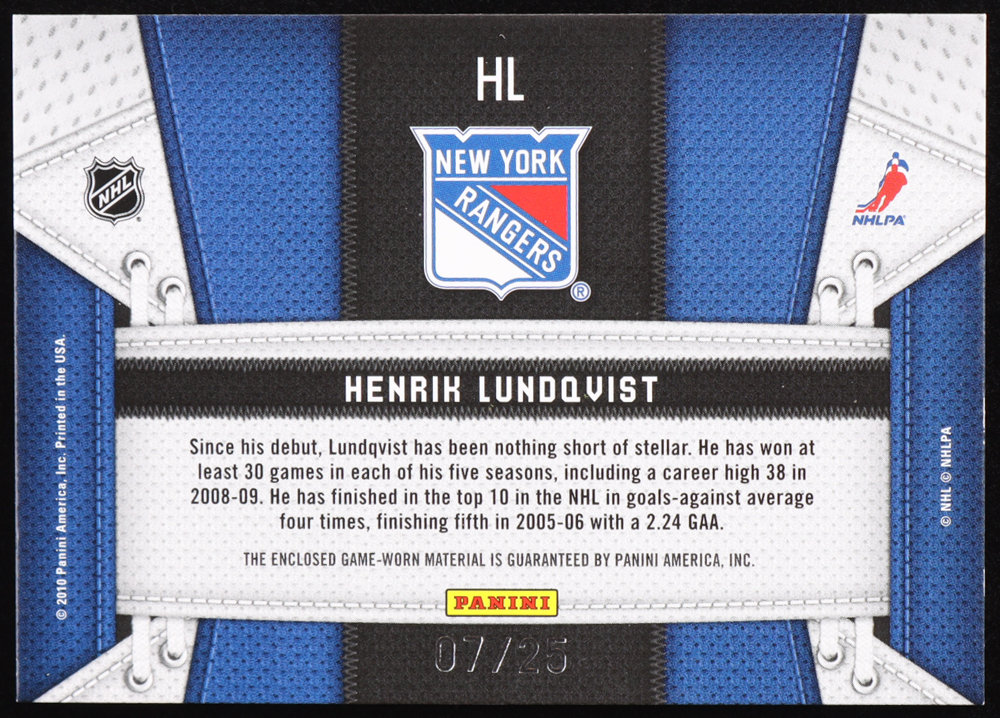 Henrik Lundqvist 2010-11 Certified Fabric of the Game Prime #HL #7/25