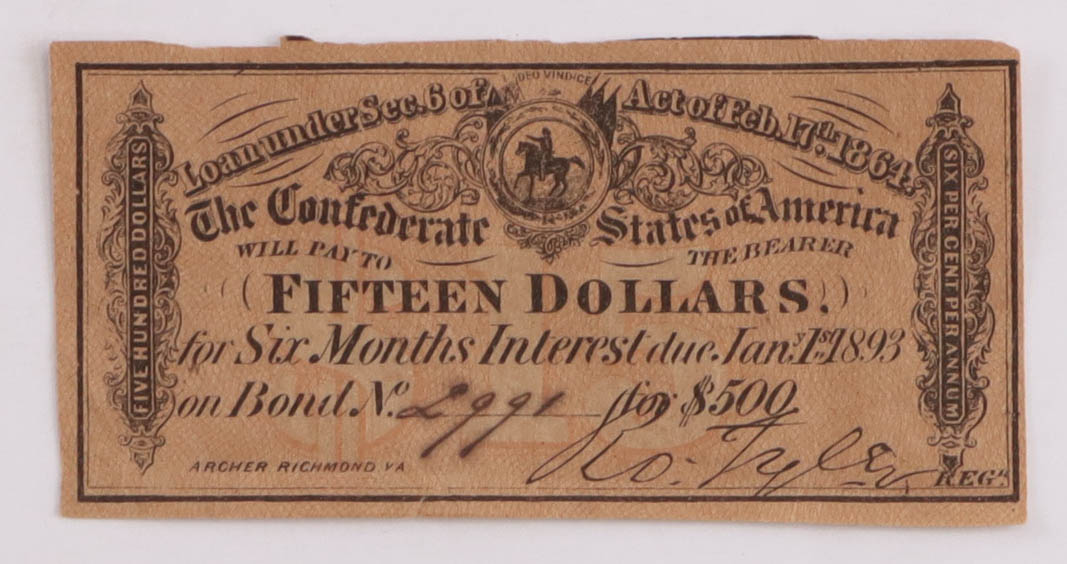 1861-64 $15 Confederate States of America First Series Bond Coupon