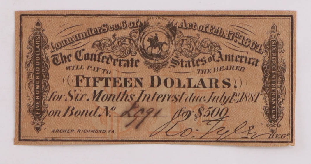 1861-64 $15 Confederate States of America First Series Bond Coupon