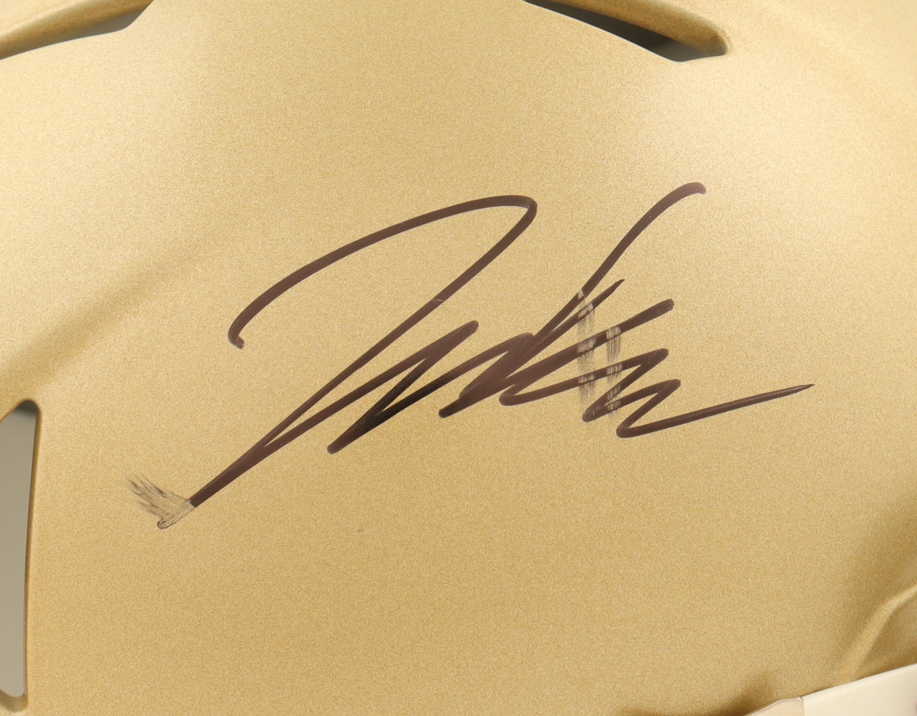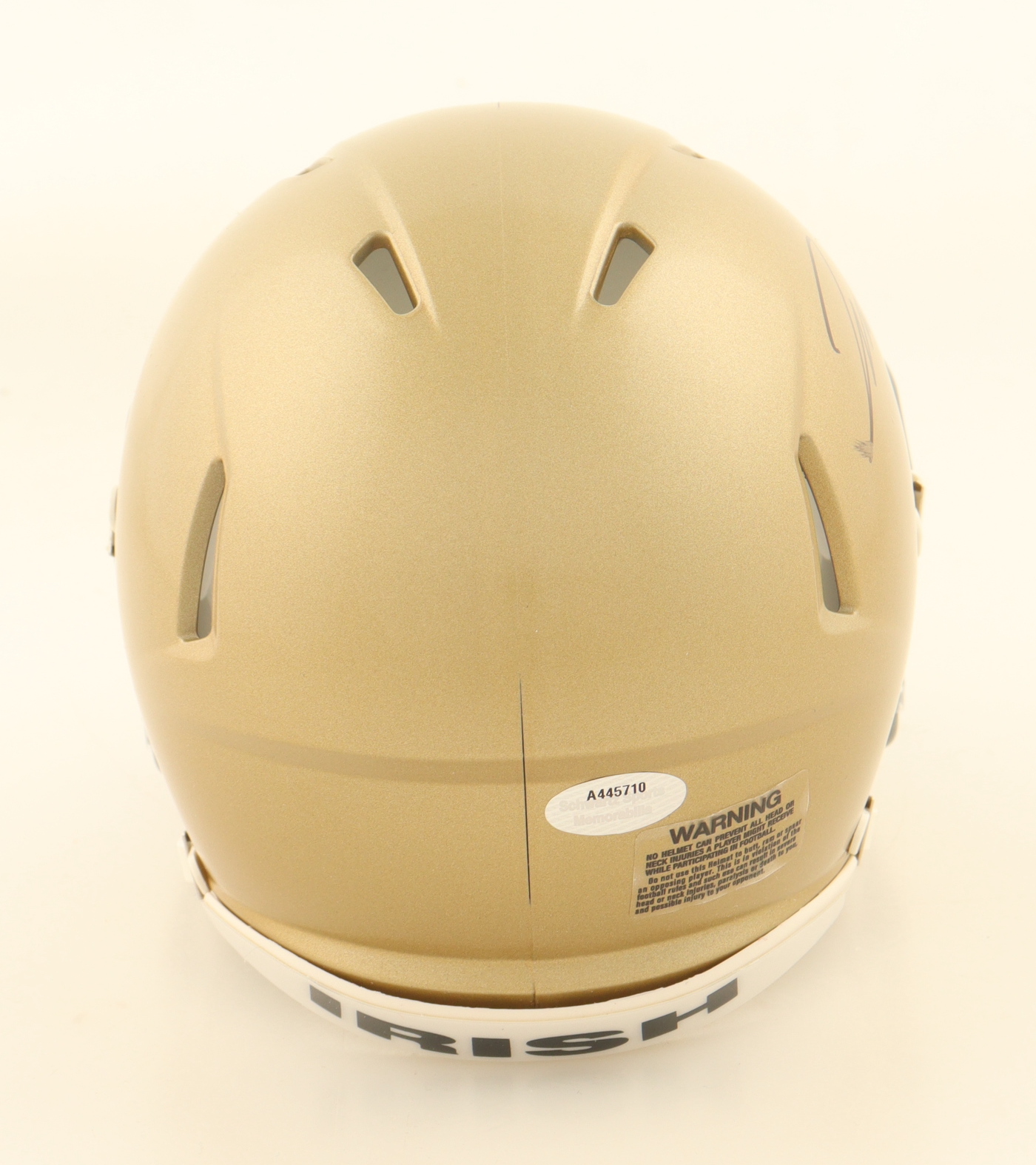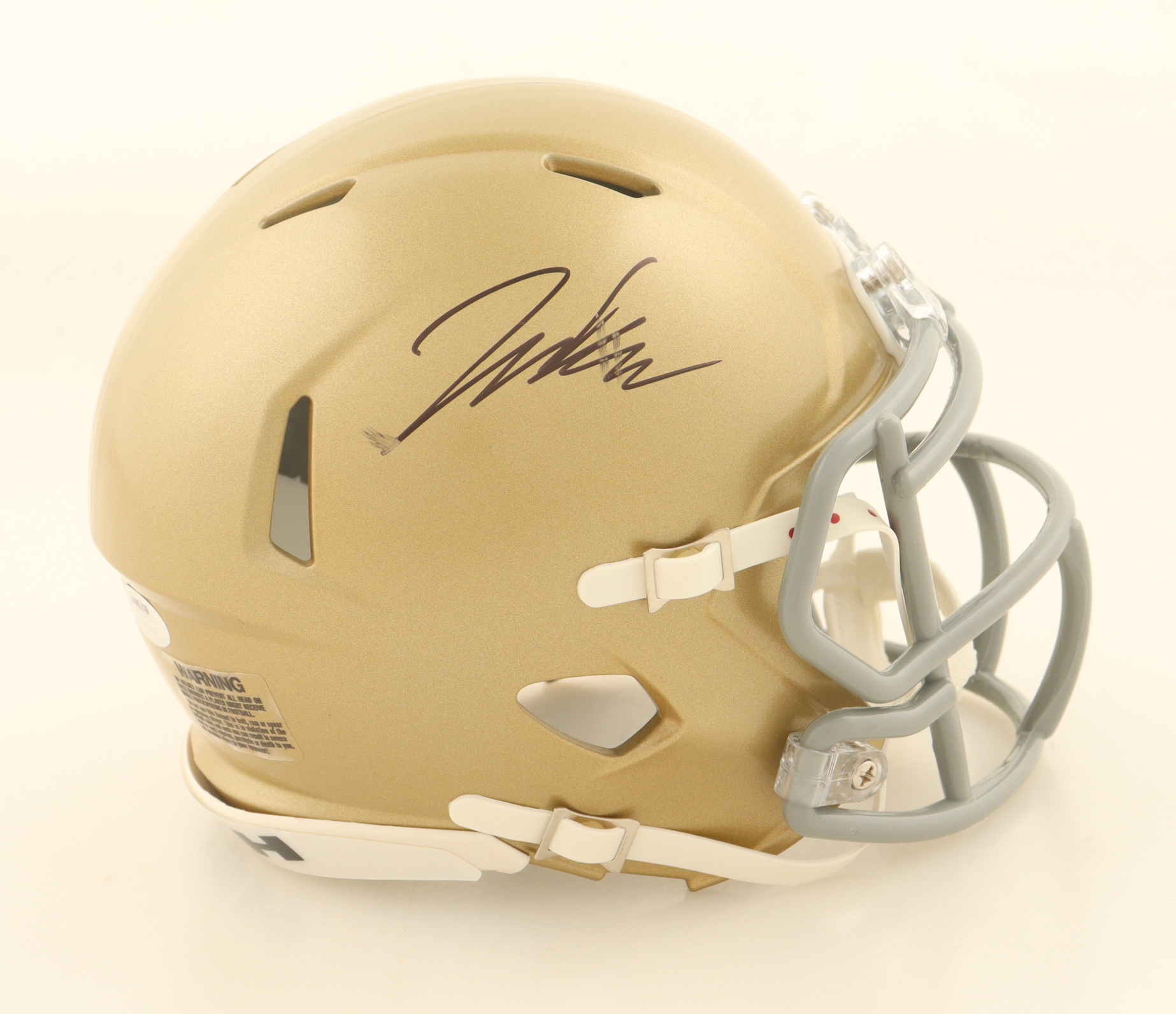 Riddell Notre Dame Fighting Irish Speed Mini Helmet has been hand-signed by Jaden Greathouse. Please note, the autograph is smudged.