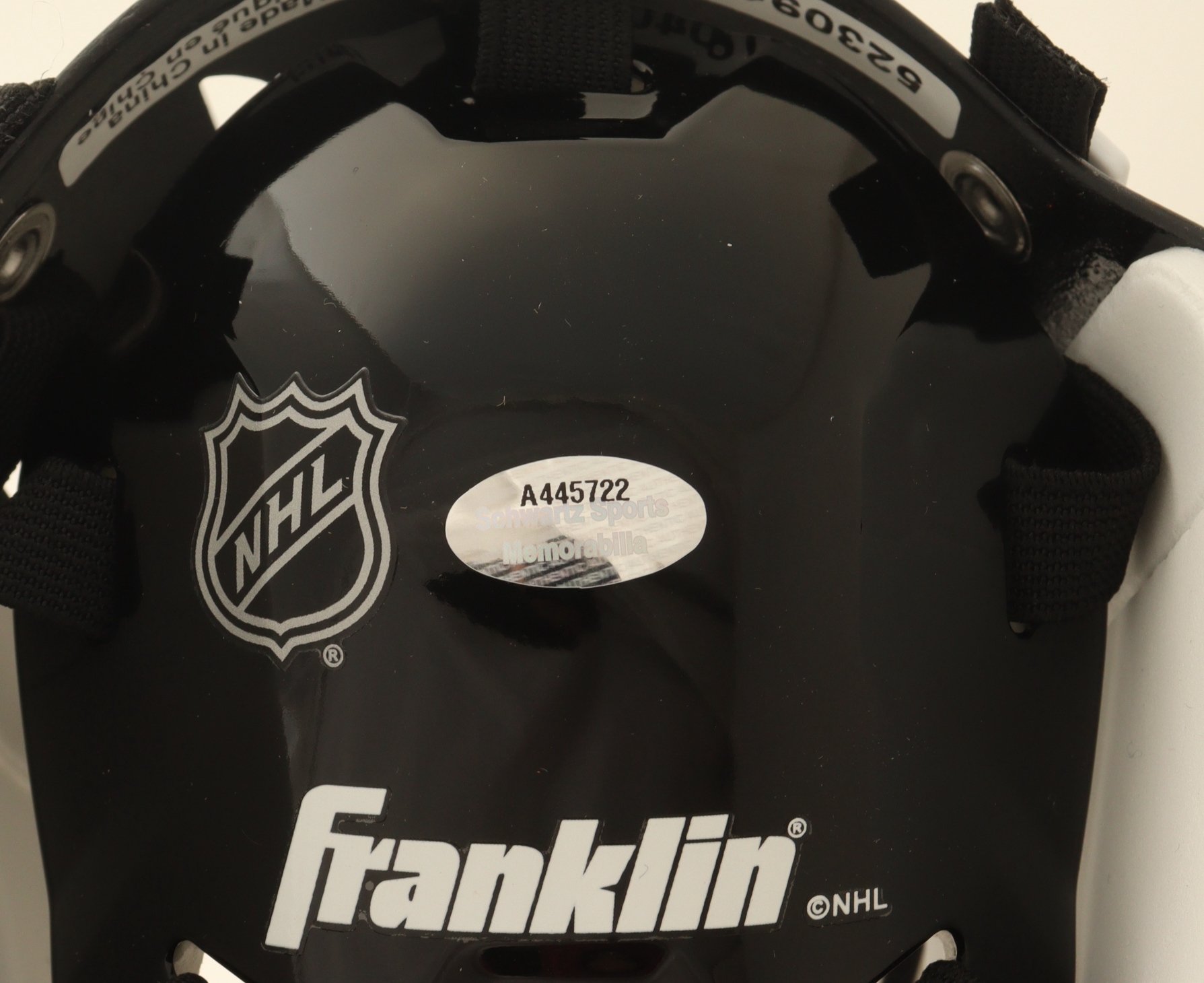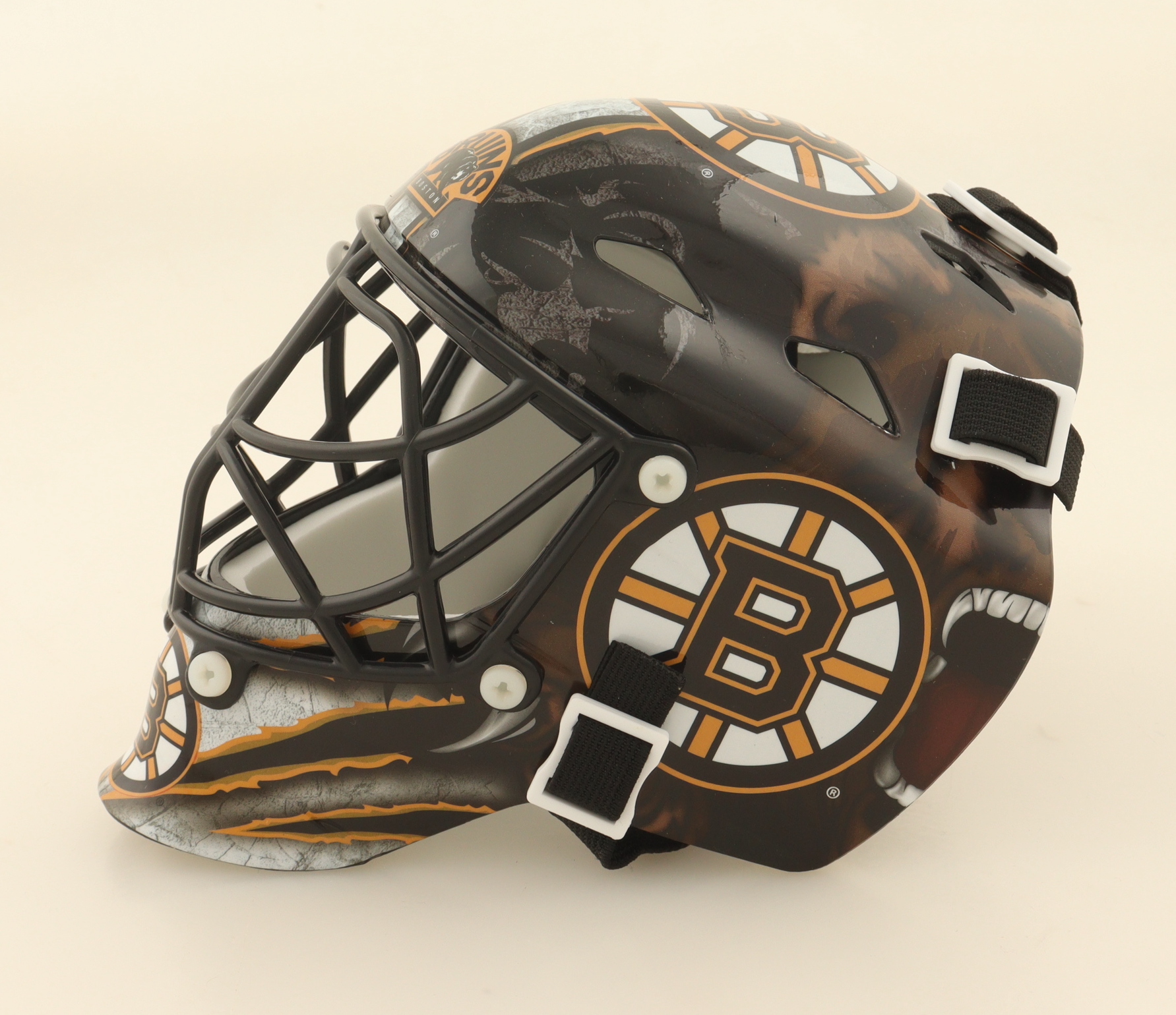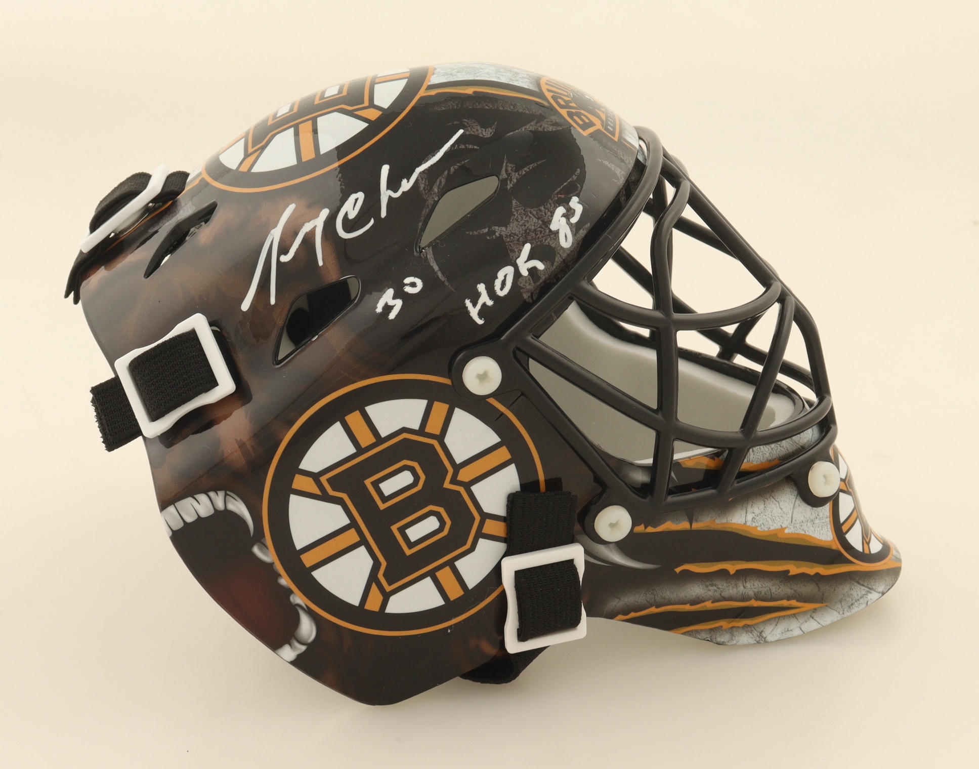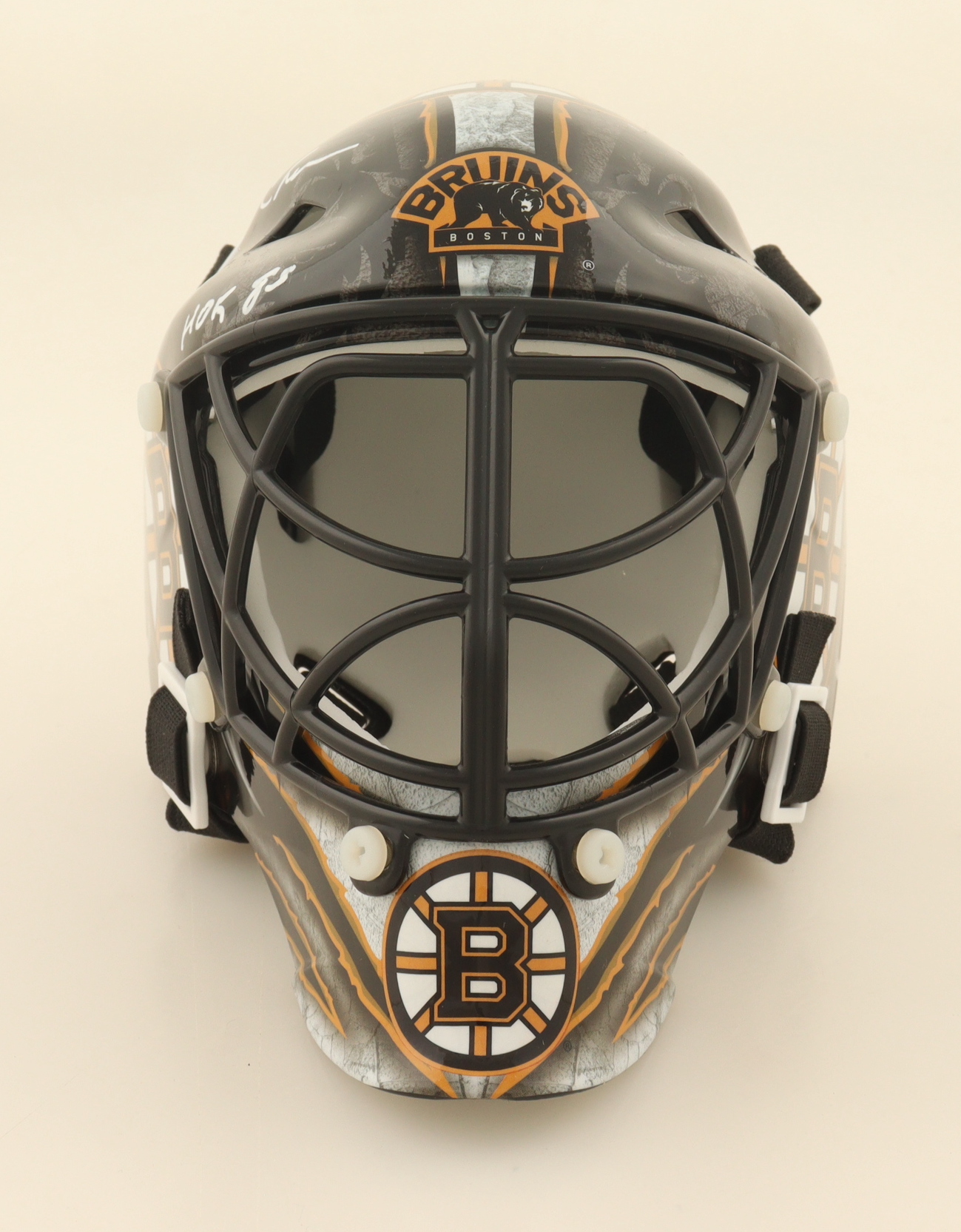 Boston Bruins mini goalie mask has been hand-signed and inscribed by Gerry Cheevers (HOF).