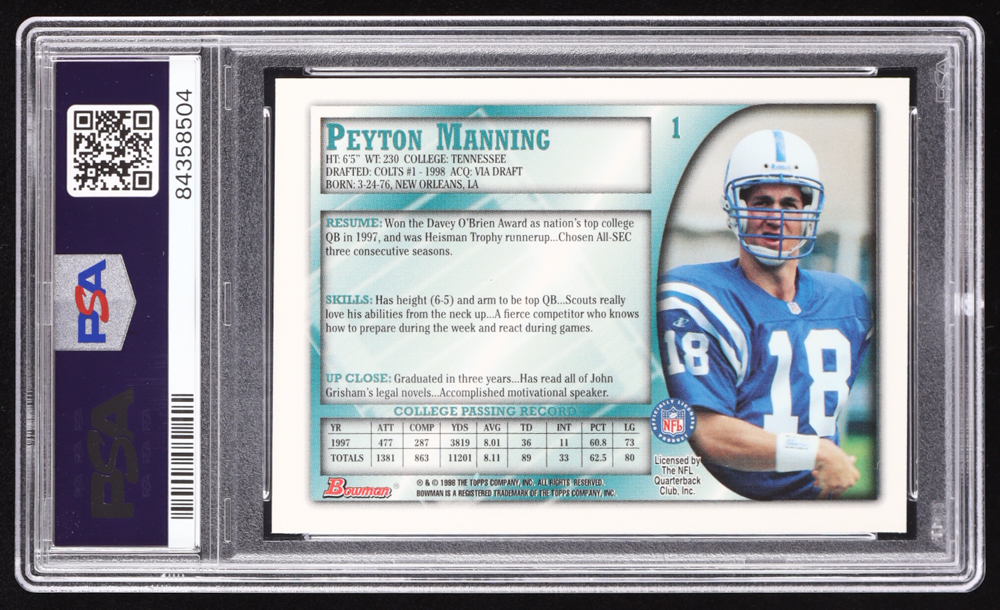 Peyton Manning 1998 Bowman #1 RC (PSA 9)
