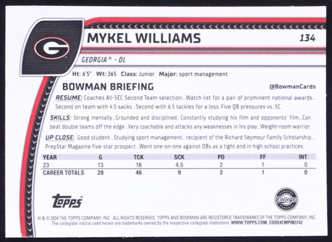 Mykel Williams 2024 Bowman Chrome University X-Fractors #134 RC