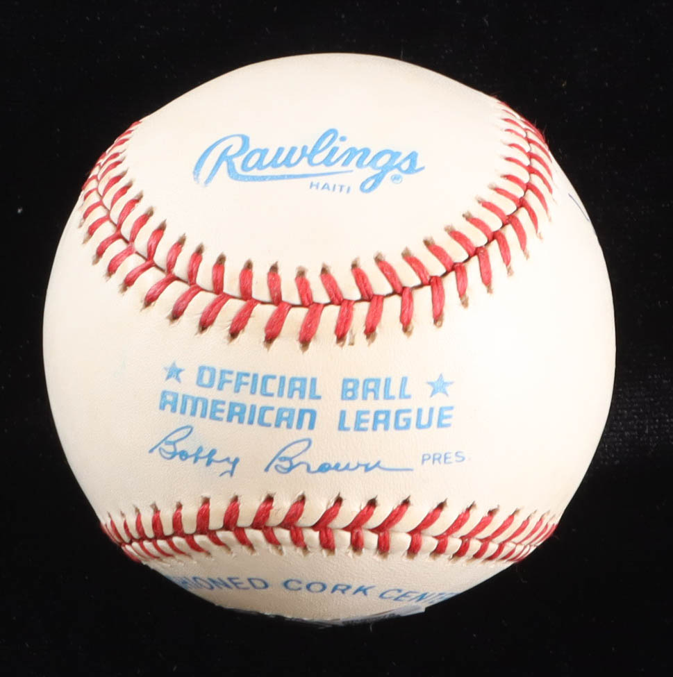 Rawlings Official American League Baseball. Hand-signed by Harmon Killebrew (D. 2011, Kansas City Royals, HOF) and Reggie Jackson (Kansas City Royals, HOF). Please note, the baseball is naturally toning and stained.