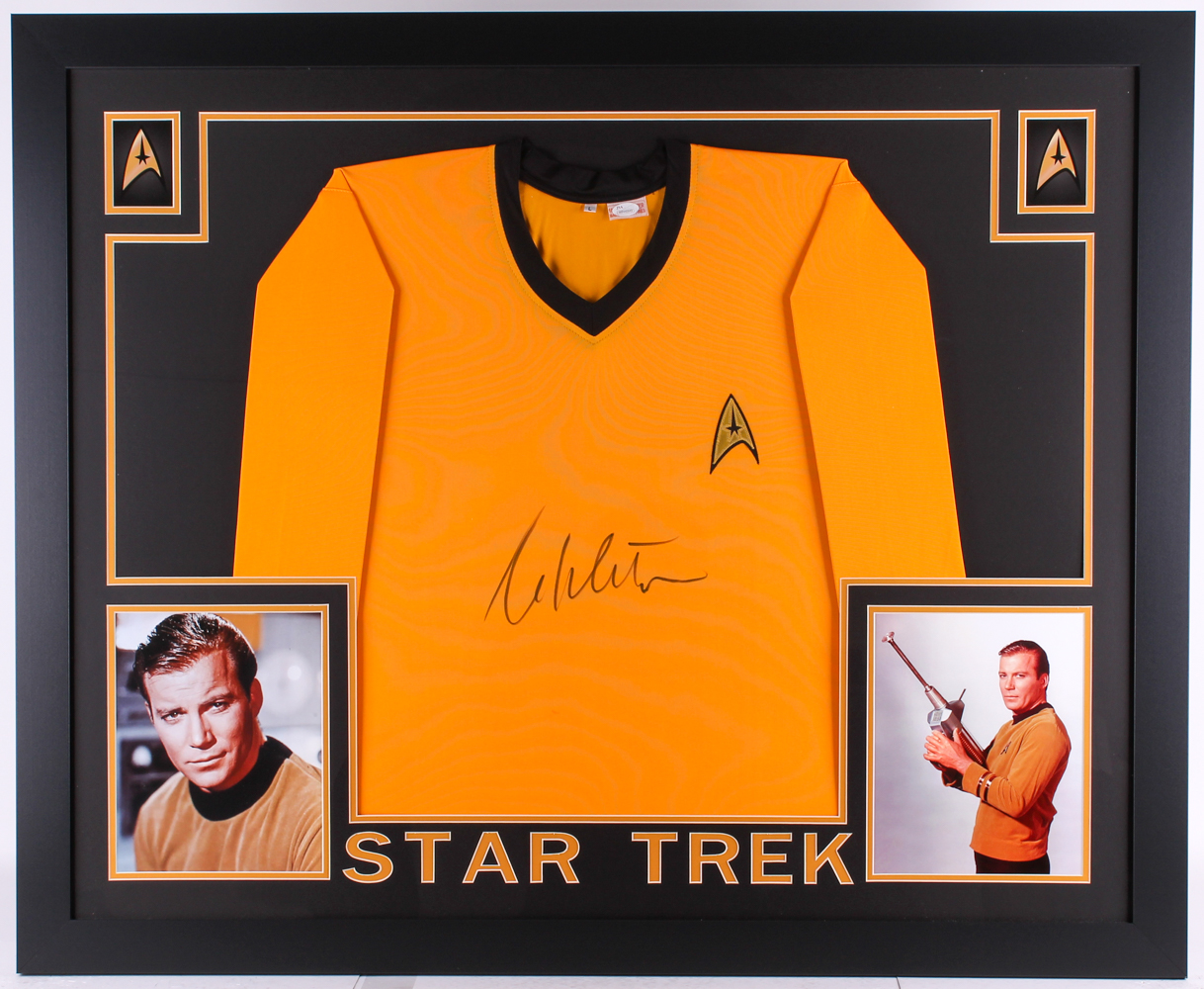 Custom frame measures approximately 35" x 43" in size and features a replica uniform which has been hand-signed in black felt-tip pen by William Shatner (Captain James T. Kirk).