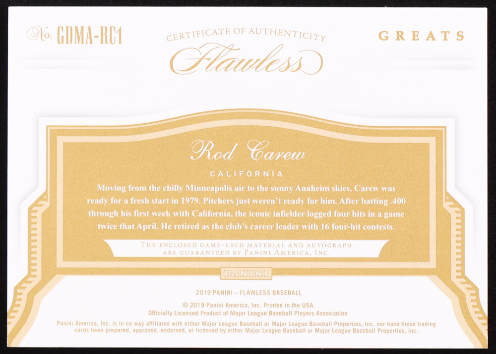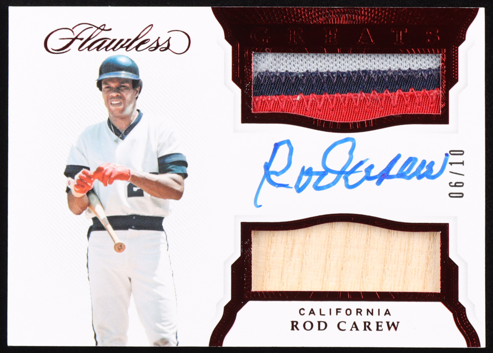 Rod Carew 2019 Panini Flawless Greats Dual Memorabilia Autographs Ruby #15 #06/10