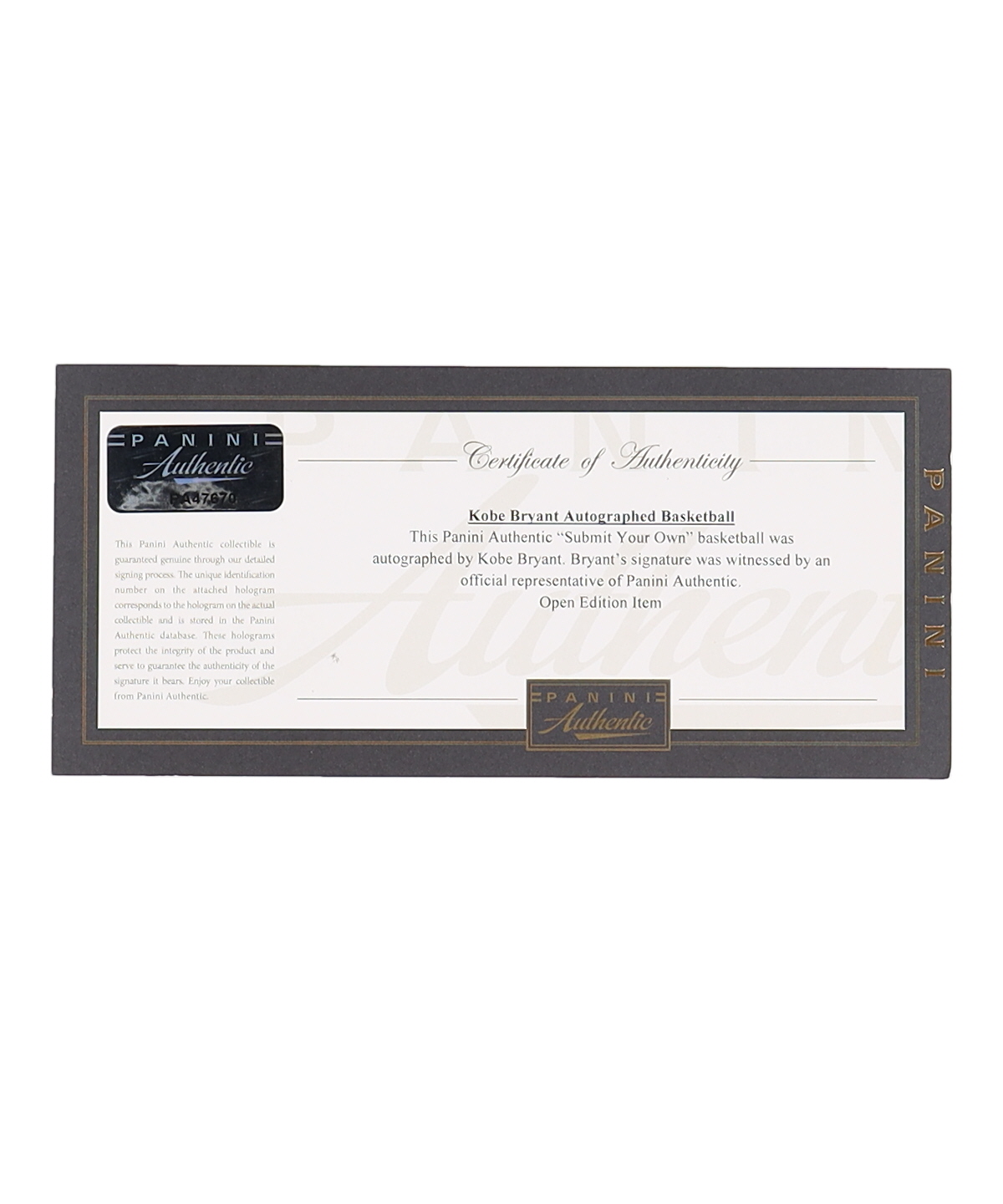 The autograph includes an official Beckett Authentication Services serially numbered hologram as well as a Panini Authentic hologram for authenticity purposes. The signing of this item was witnessed by Beckett.
