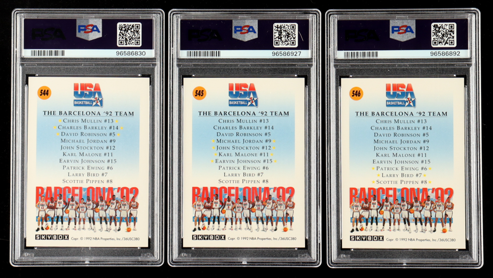 This three-card set features (10) players from the 1992 Team USA Olympic basketball team, with Chris Mullin, Charles Barkley, David Robinson, Michael Jordan, John Stockton, Karl Malone, Magic Johnson, Patrick Ewing, Larry Bird, and Scottie Pippen.