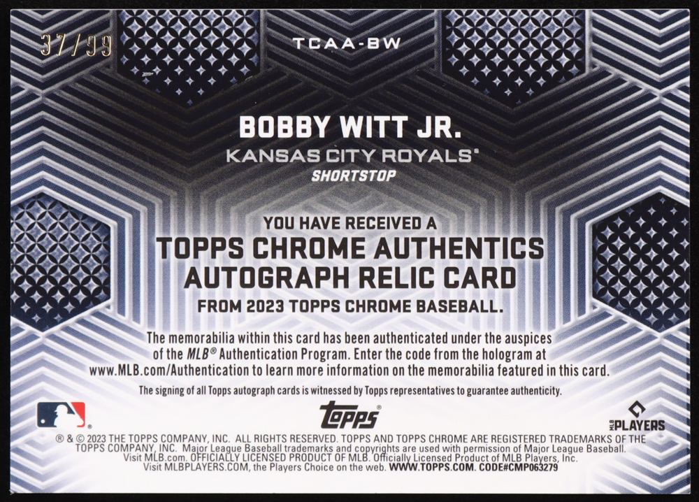Bobby Witt Jr. 2023 Topps Chrome Authentics Relics Autographs #TCAABW #37/99