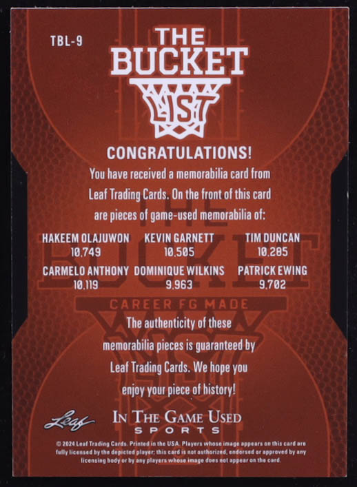 2024 ITG Used Sports The Bucket List Bronze #TBL9 #5/5 Hakeem Olajuwon / Kevin Garnett / Tim Duncan / Carmelo Anthony / Dominique Wilkins / Patrick Ewing