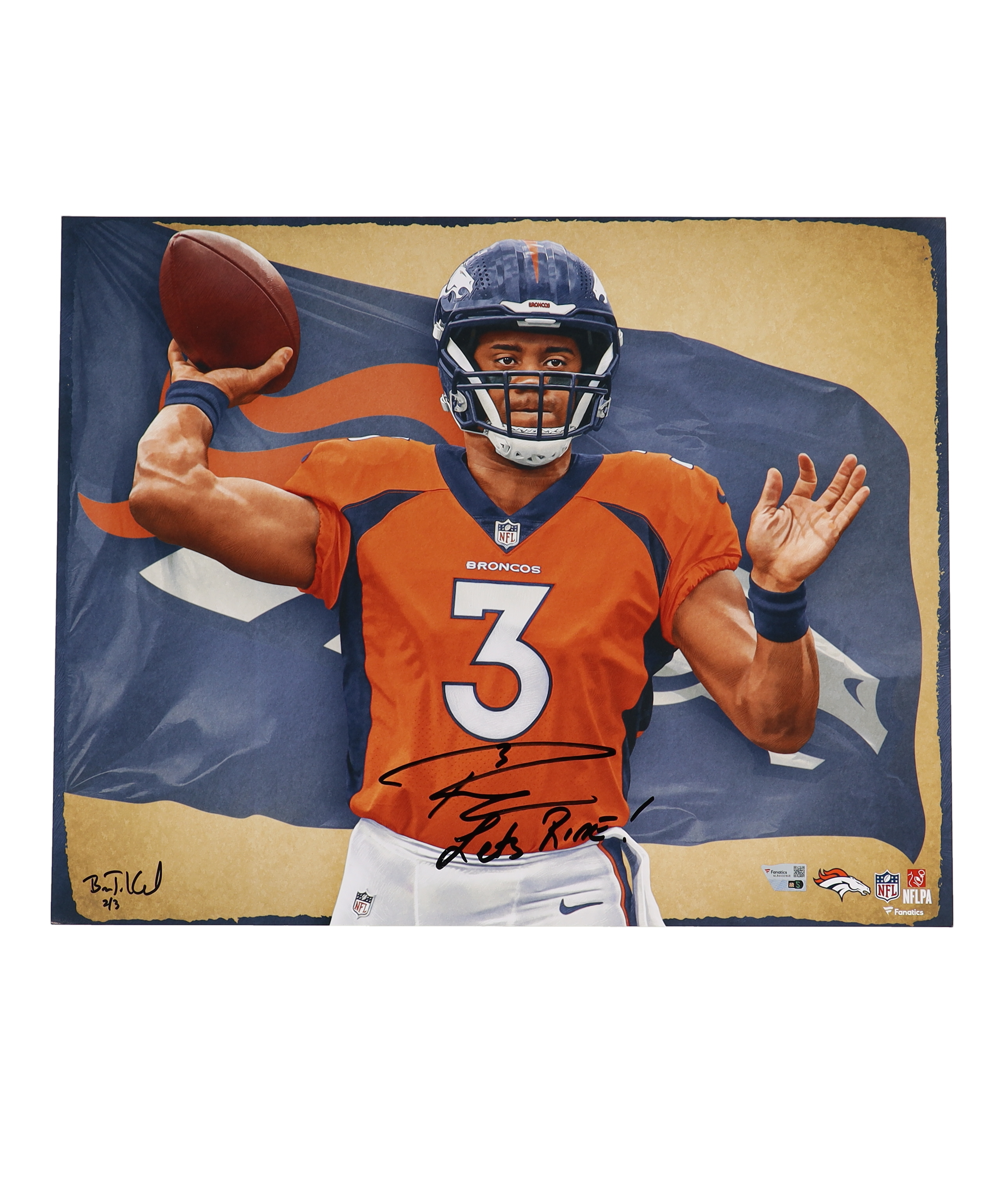 Photo measures 16" x 20" in size and has been hand-signed and inscribed by Russell Wilson (Denver Broncos) and the artist, Brian Konnick. This item is limited edition, hand numbered 2 out of 3. Please note, the inscription is scuffed.