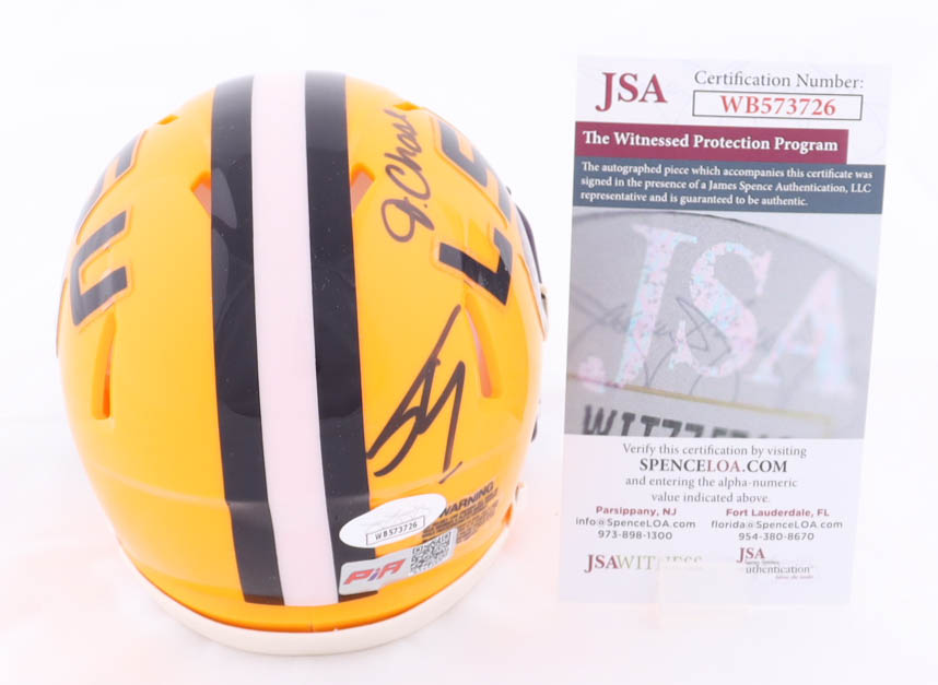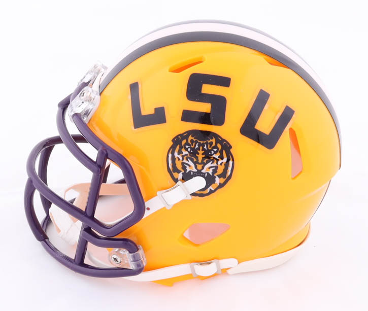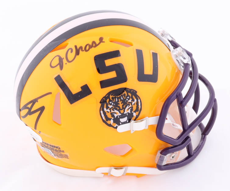 Riddell Louisiana State Tigers Speed mini helmet. Hand-signed by Shaquille O'Neal (HOF) and J'Marr Chase (Cincinnati Bengals).