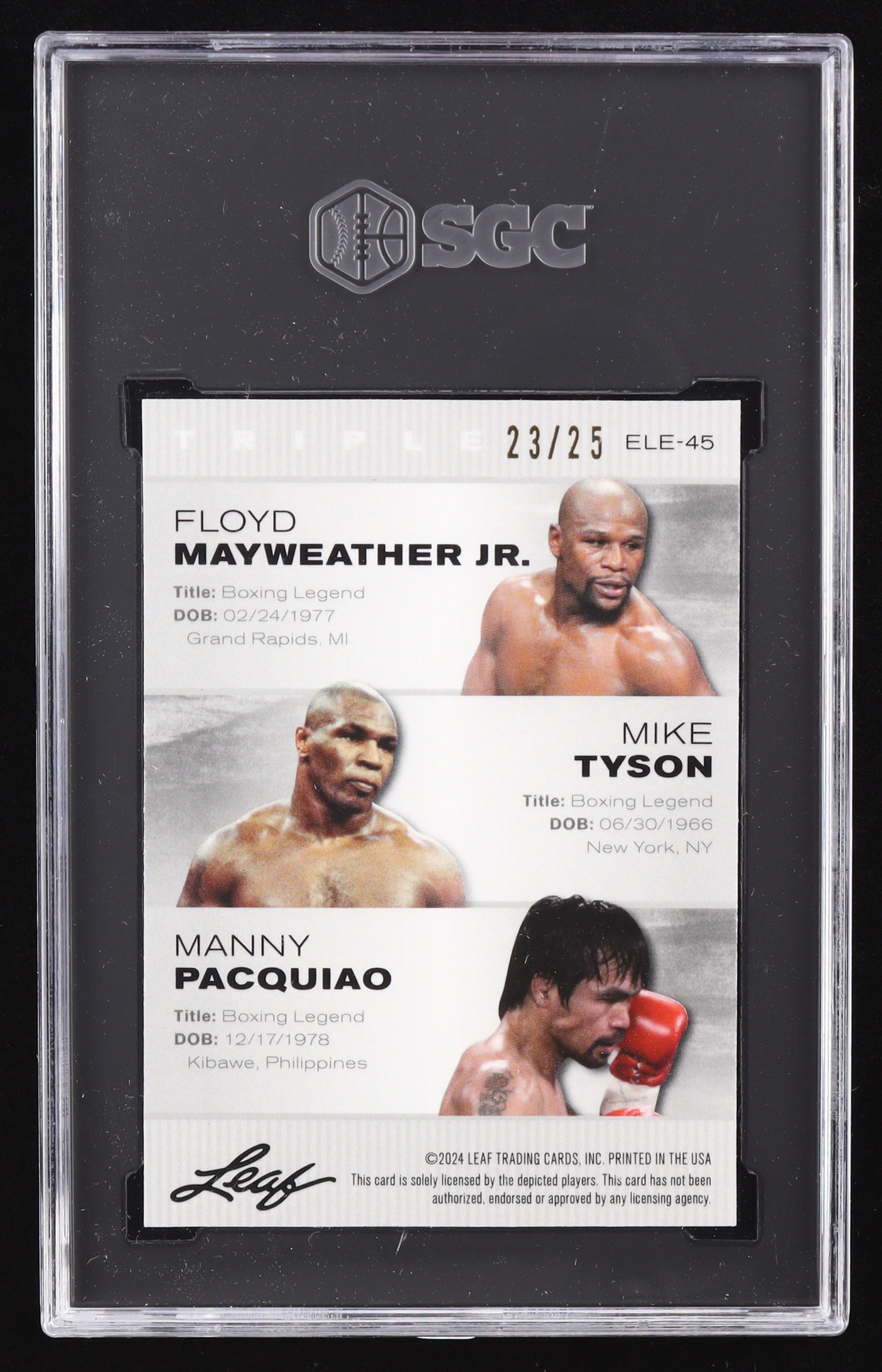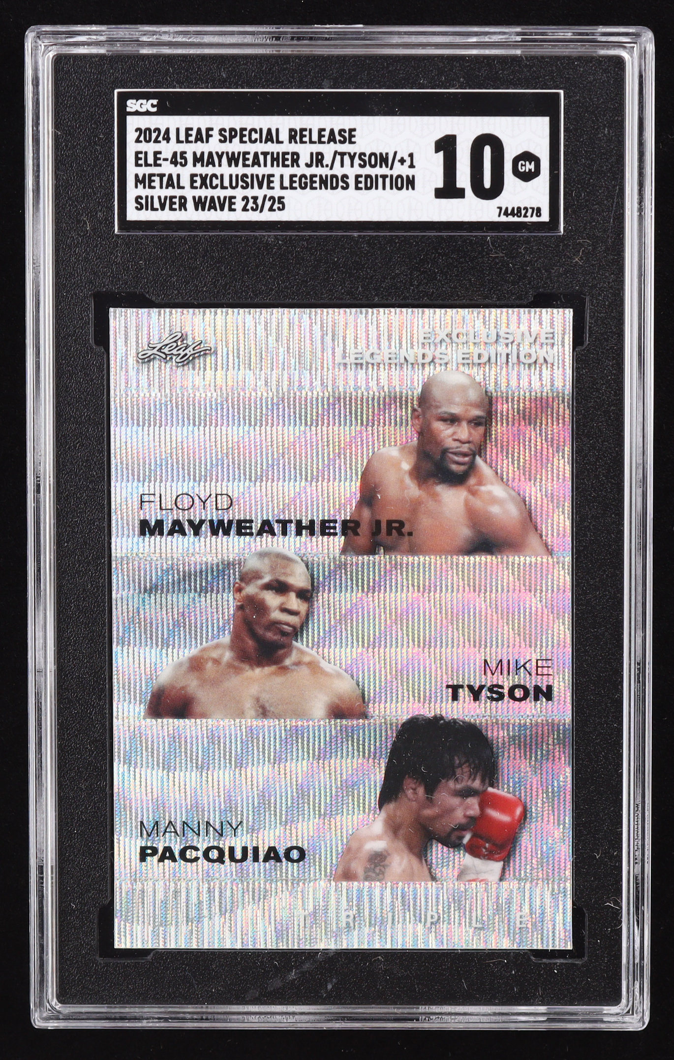 Mike Tyson / Floyd Mayweather Jr. / Manny Pacquiao 2024 Leaf Special Release Metal Exclusive Legends Silver Wave #ELE45 #23/25 (SGC 10)