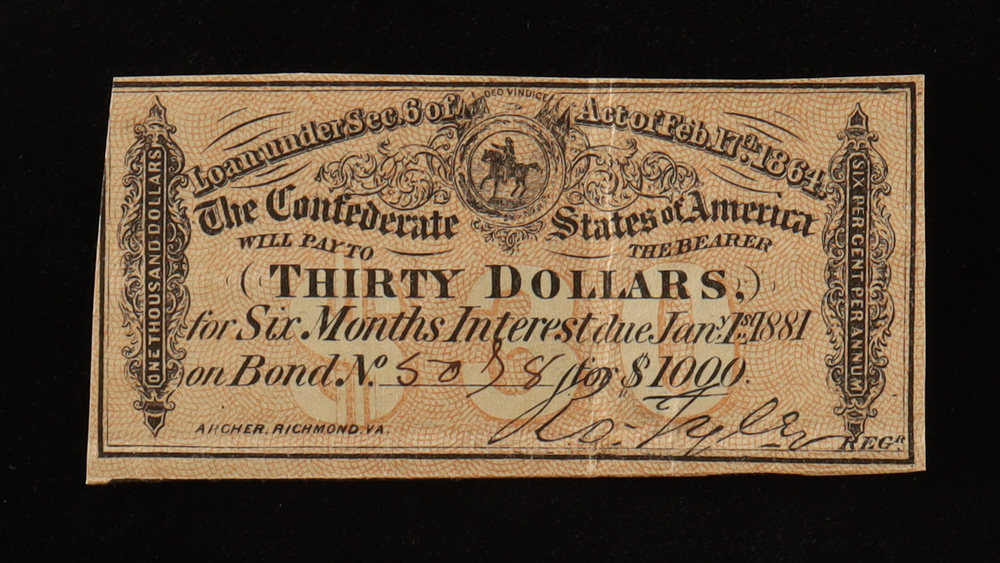 1864 $30 Confederate States of America CSA Bank Note Bond