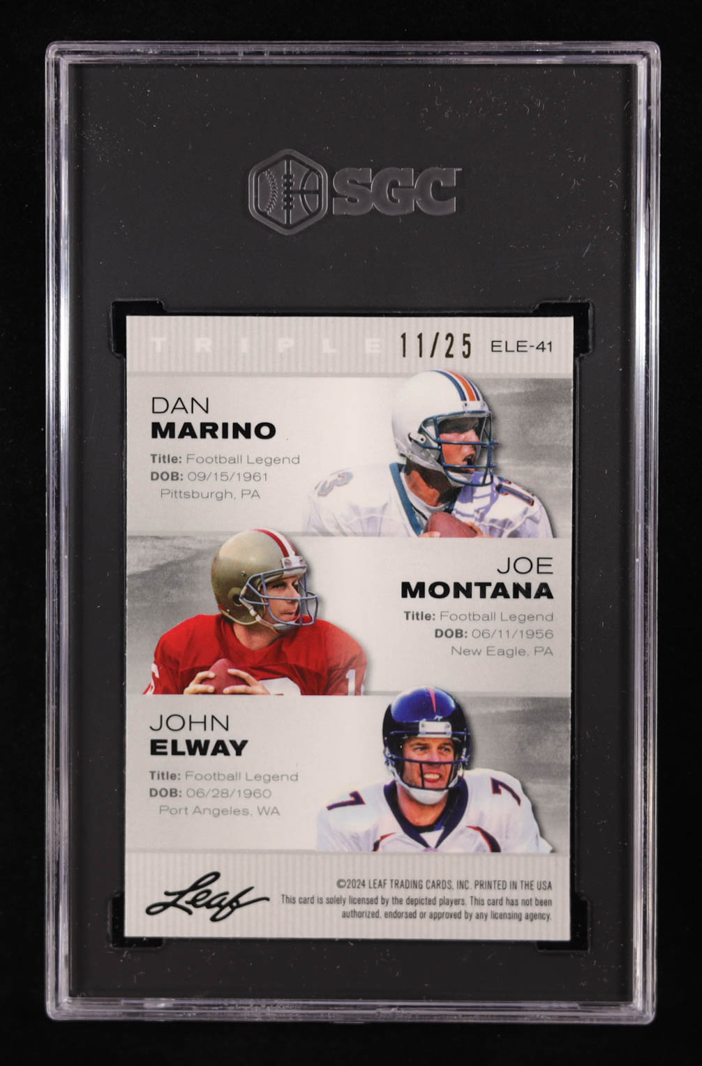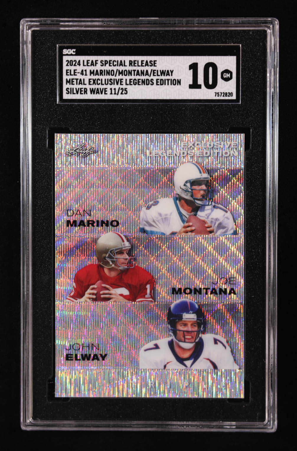 Dan Marino / Joe Montana / John Elway 2024 Leaf Special Release Metal Exclusive Legends Edition Silver Wave #ELE41 #11/25 (SGC 10)